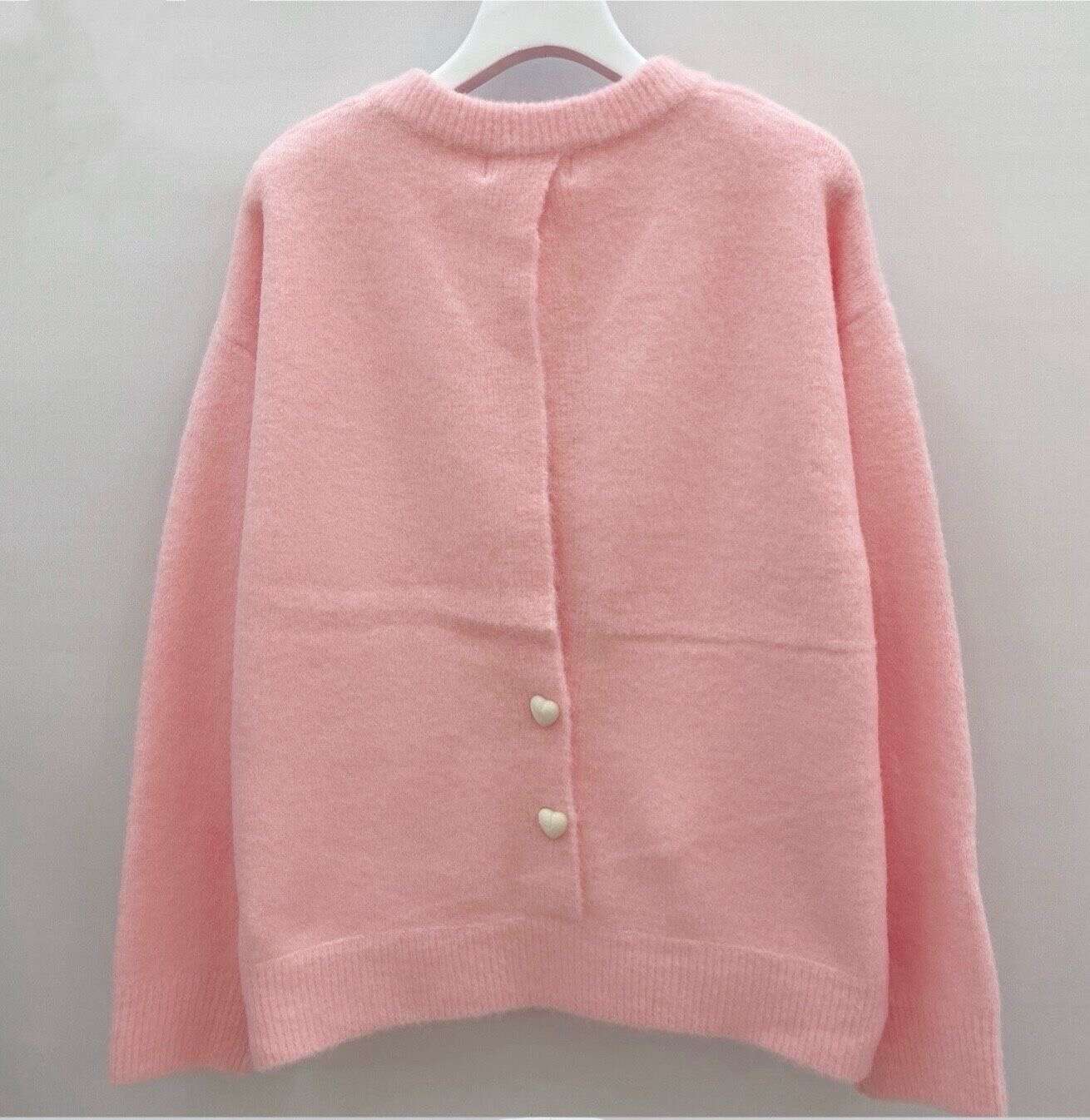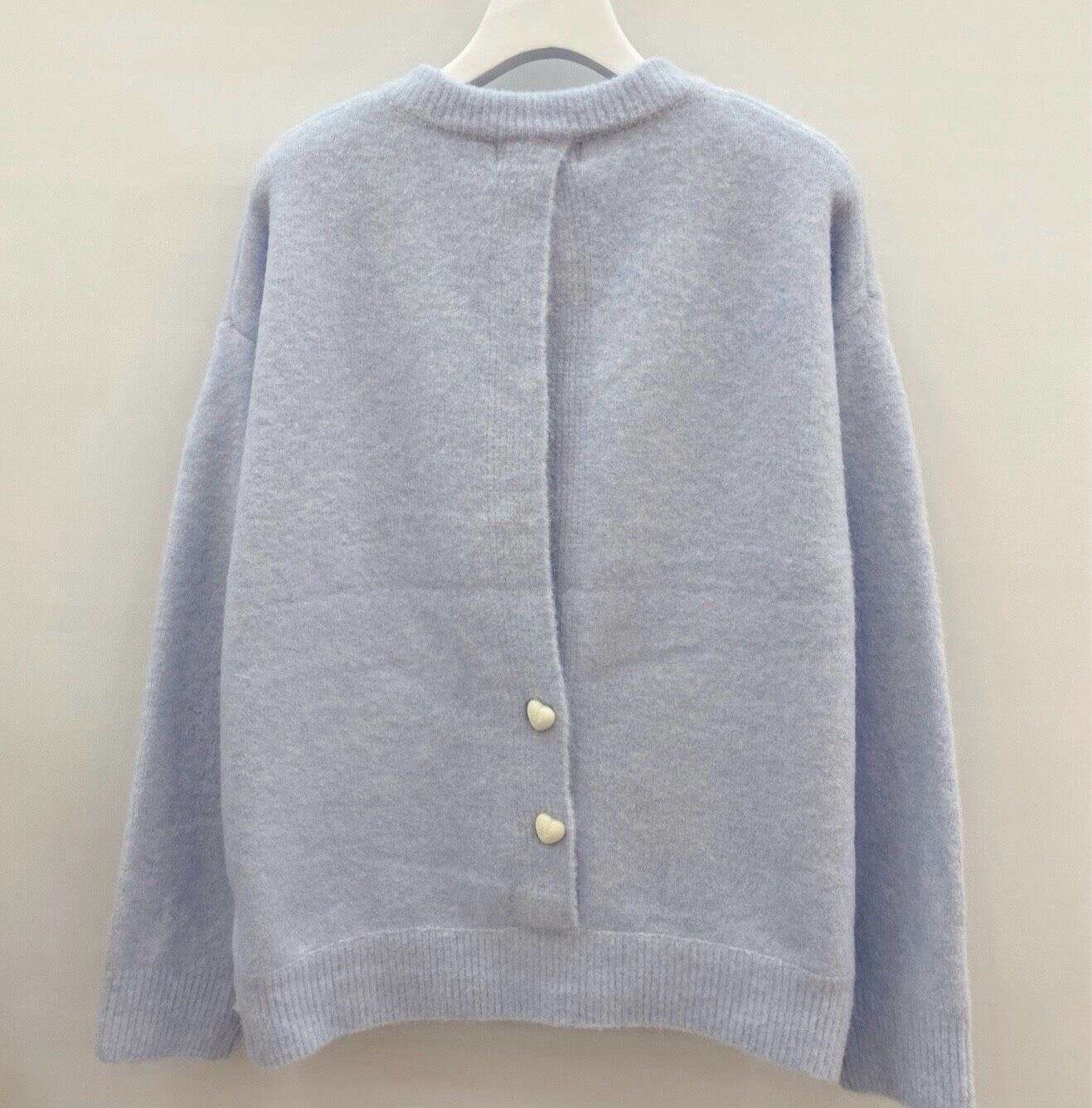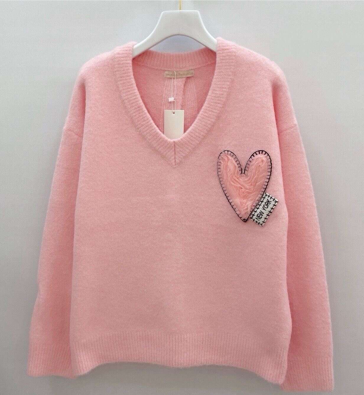 Miękki sweter o luźnym kroju z dekoltem w serek i uroczą naszywką w kształcie serca, gwarantujący wygodę i styl na każdą okazję.