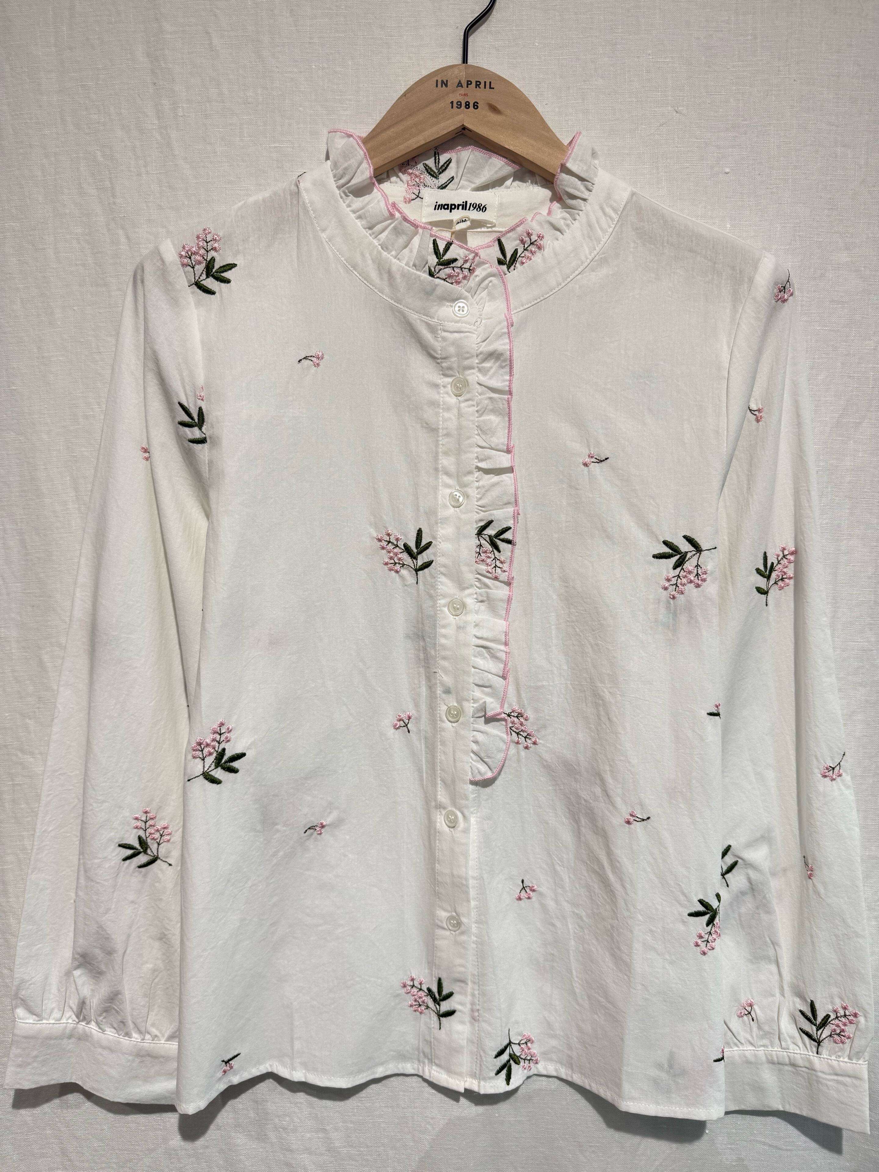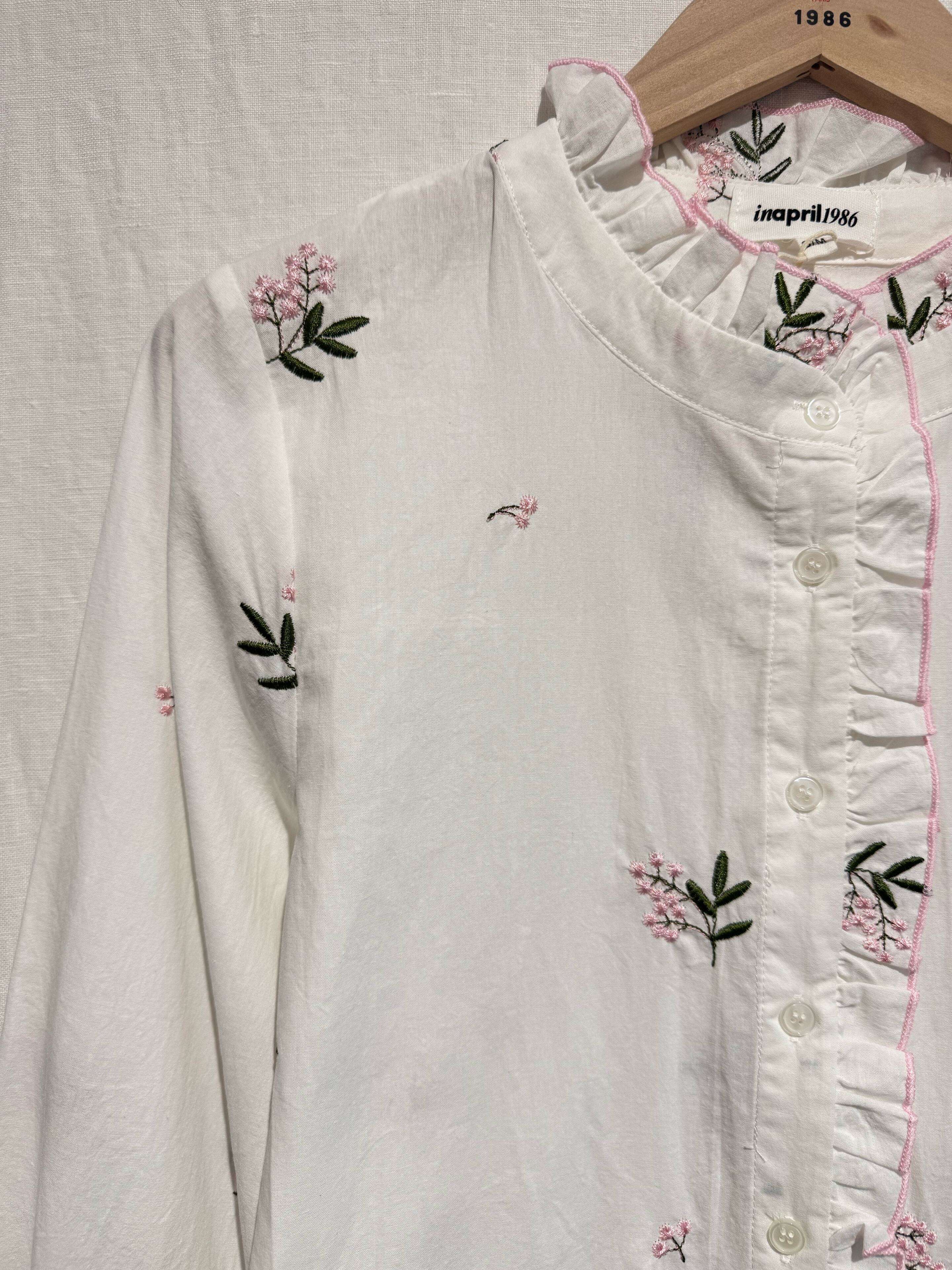 Biała koszula z delikatnym haftem kwiatowym, ozdobnym falowanym kołnierzykiem i różowymi detalami. Kobieca, wygodna i stylowa.