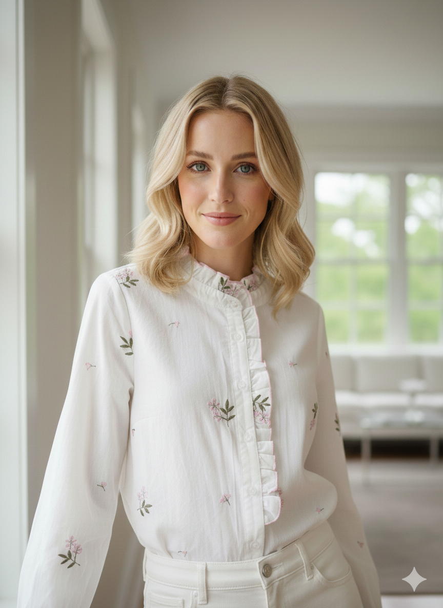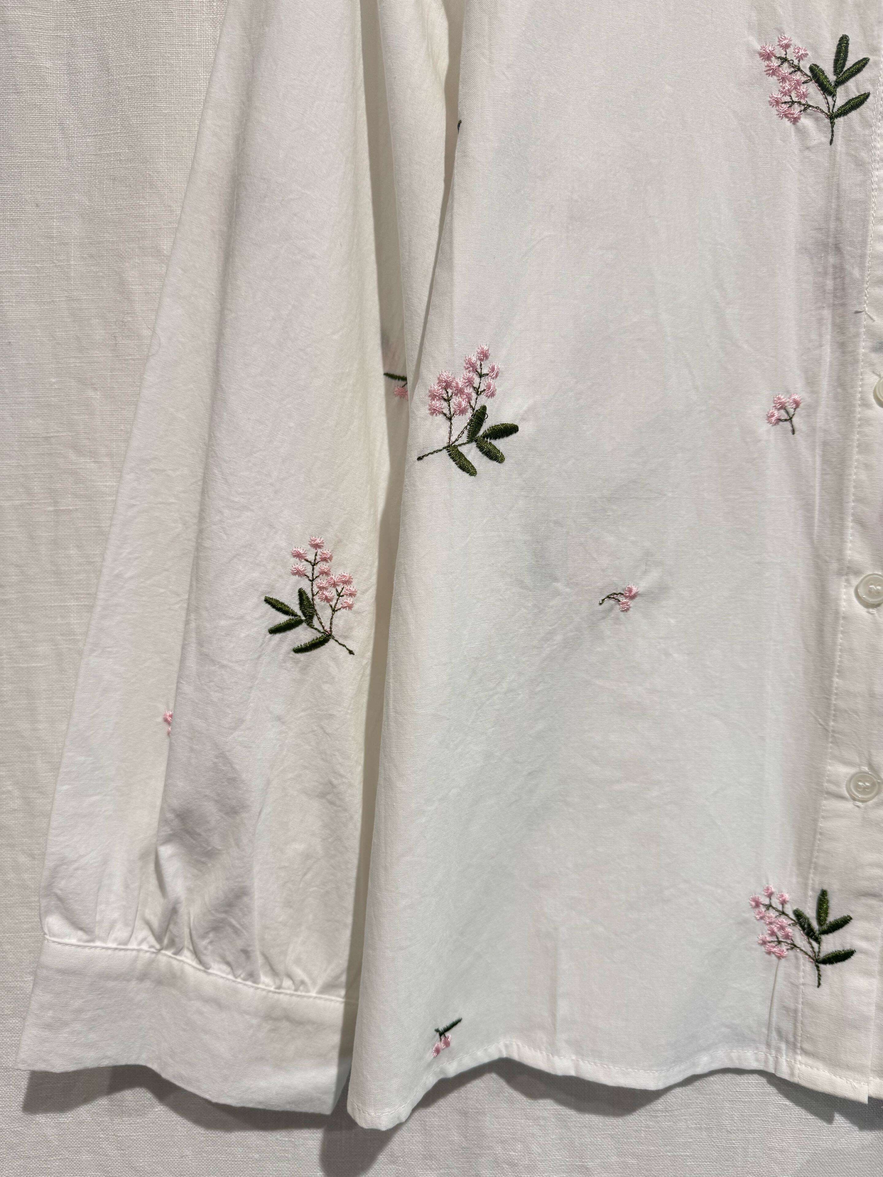 Koszula BLOOMY to propozycja dla hurtowni, które cenią sobie niepowtarzalny styl oraz wysoką jakość wykonania. Delikatny, biały materiał zdobią romantyczne hafty w kwiatowe motywy, a swobodny fason zapewnia komfort noszenia przez cały dzień. Stójka wykończona falbanką oraz subtelne guziki dodają koszuli lekkości i elegancji. Doskonała do stylizacji casualowych i półformalnych, idealna na spotkania, do pracy czy jako baza sezonowych kolekcji. Dostępna w kolorze białym – ponadczasowy wybór dla sklepów oferujących klasyczną i kobiecą modę.