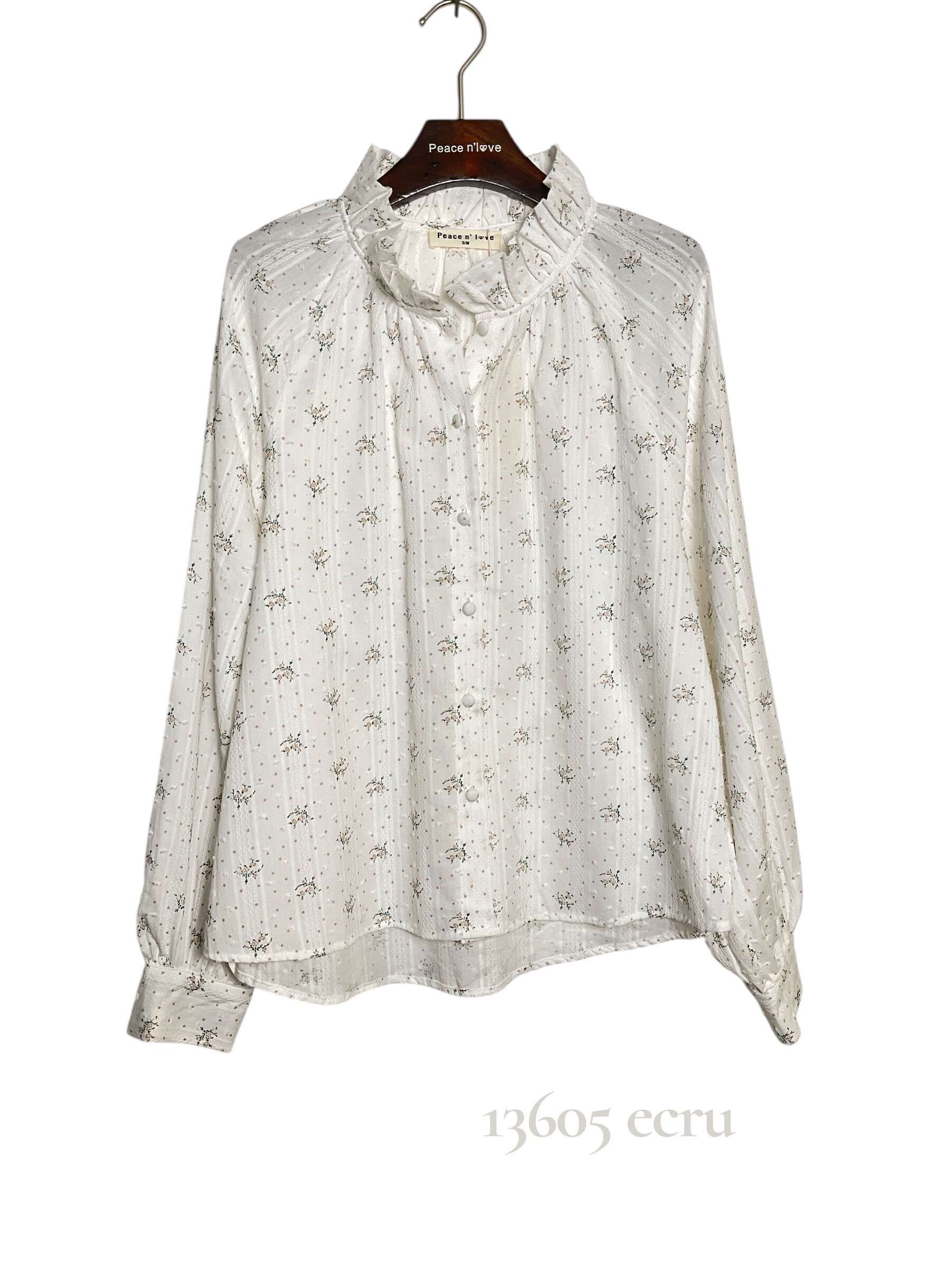 Lekka koszula o romantycznym kroju z delikatnym wzorem, zdobiona falbanką przy stójce, idealna na co dzień i specjalne okazje.