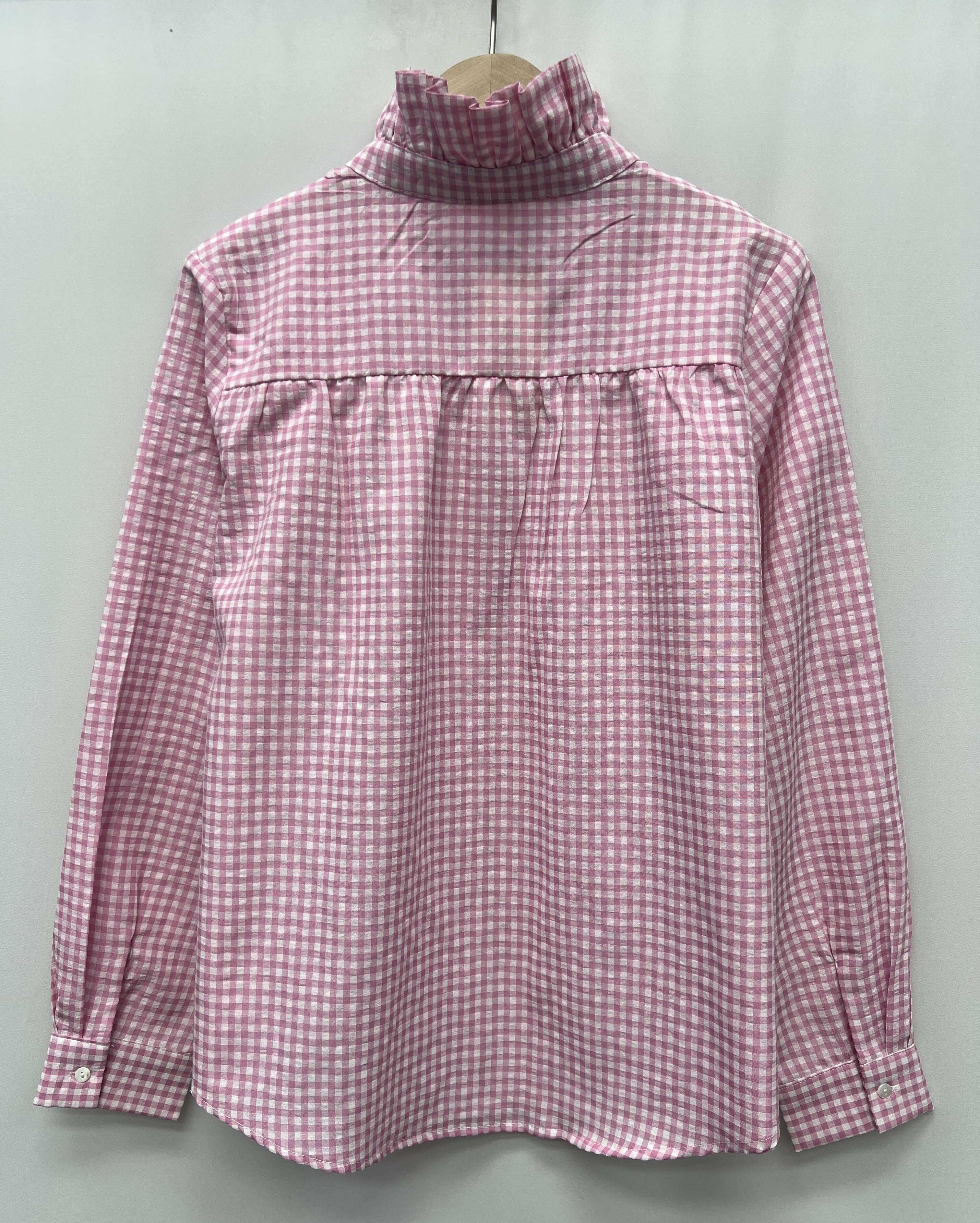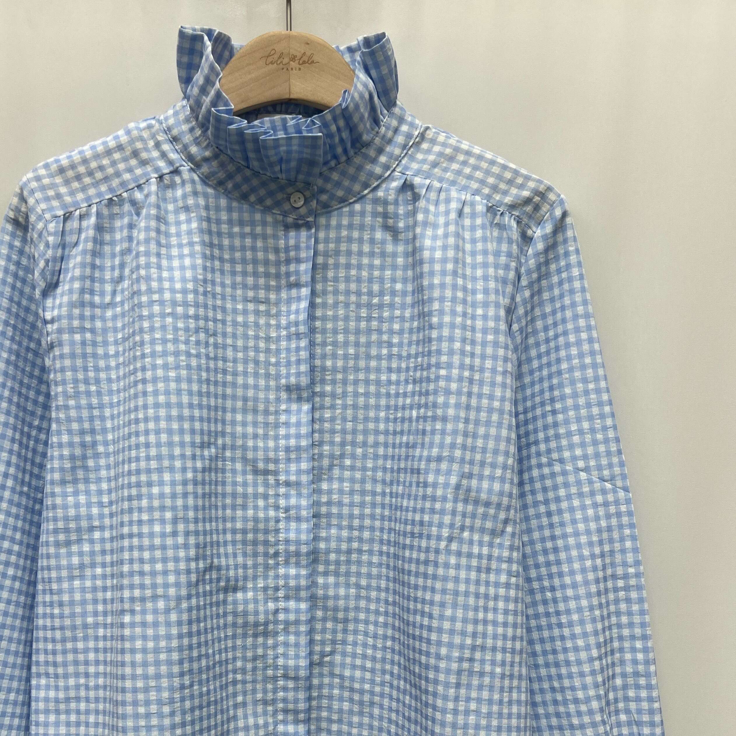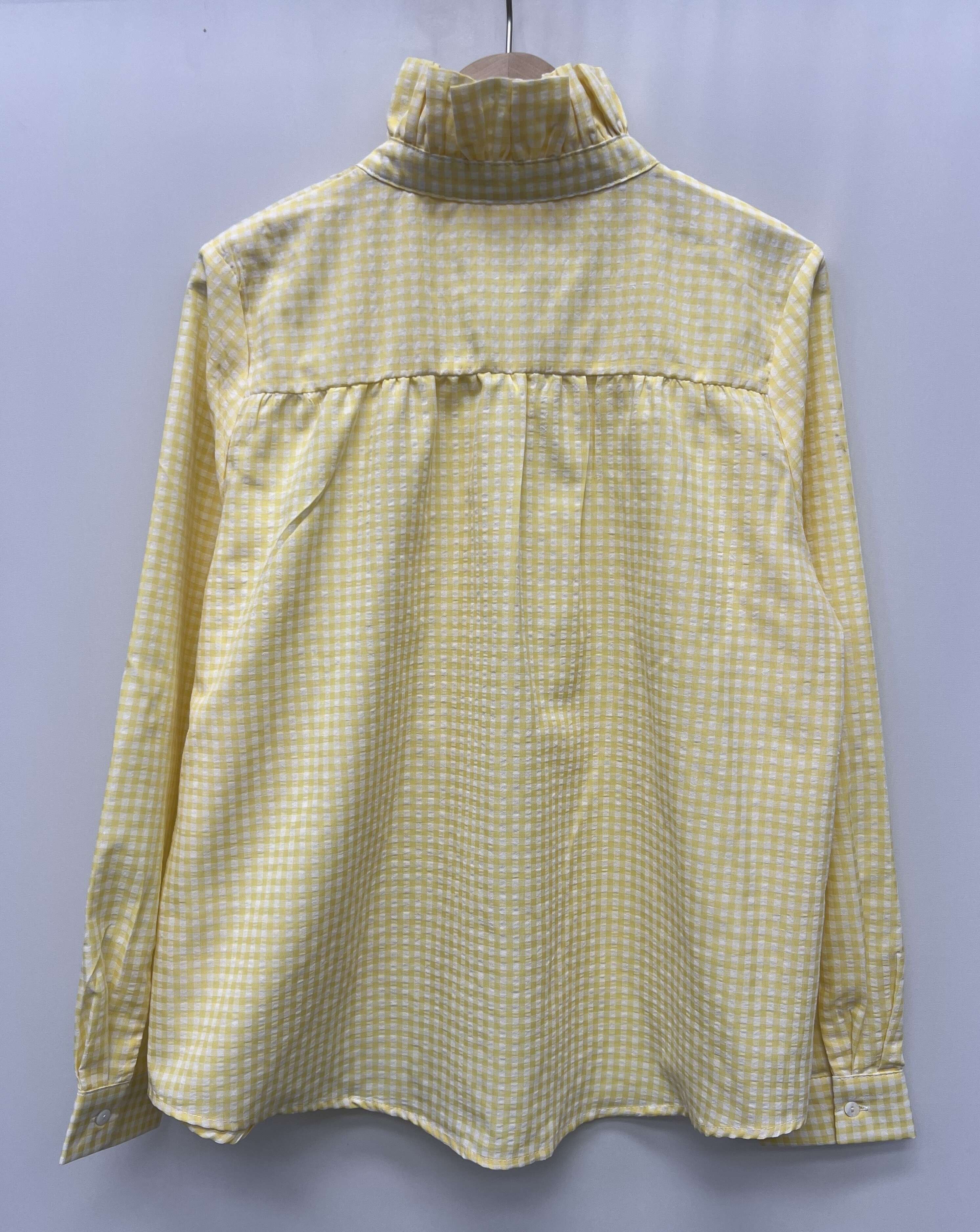 Koszula z delikatnej tkaniny w żółtą kratkę, z falbanką przy stójce i z długimi rękawami. Świetnie sprawdzi się do stylizacji casualowych i eleganckich.