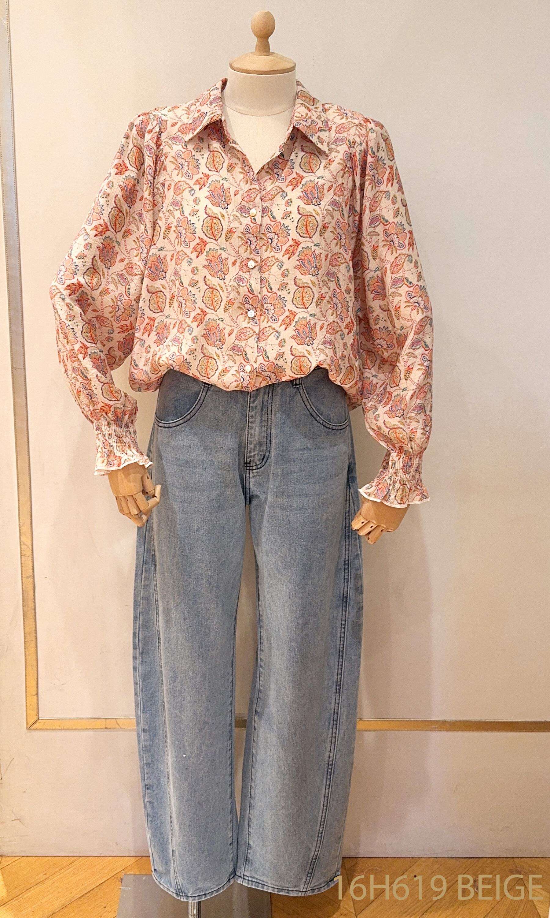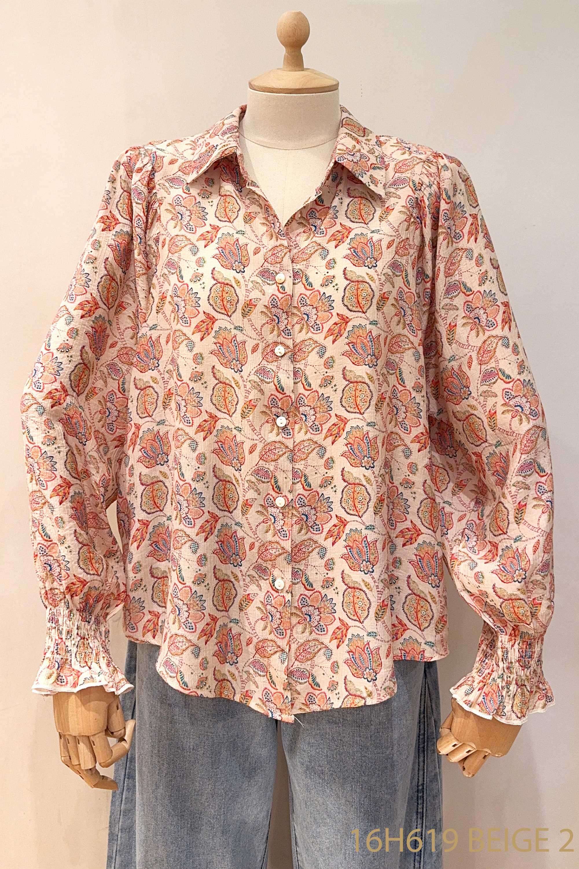 Lekka koszula o luźnym kroju z efektownym, kolorowym wzorem i eleganckimi marszczeniami na mankietach.