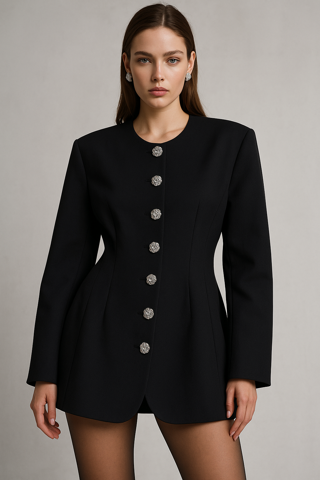 Taliowany żakiet z biżuteryjnymi guzikami, wykonany z mieszanki bawełny i poliestru, dostępny w klasycznej czerni i ponadczasowej bieli.
