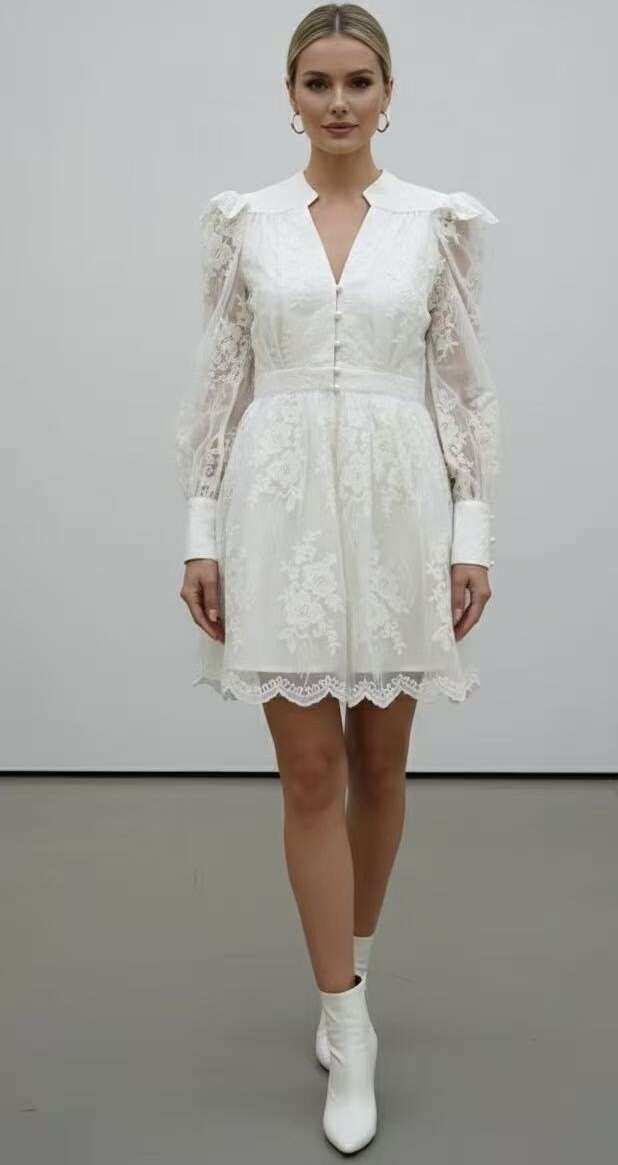 Subtelna, elegancka sukienka z koronkowymi detalami, bufiastymi rękawami i kobiecym fasonem.