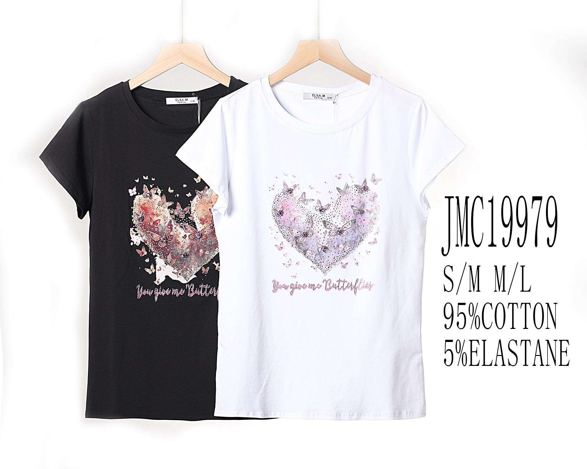 Modna bluzka z motywem serca i motyli, wykonana z przewiewnej bawełny z domieszką elastanu. Dostępna w klasycznych kolorach – czarnym i białym.