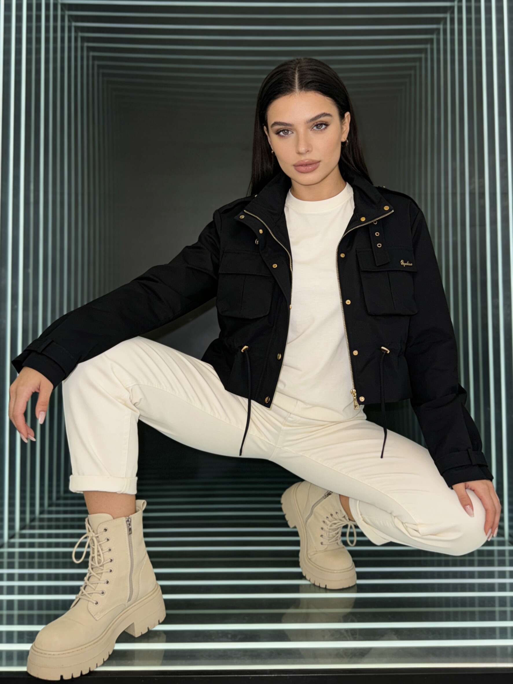Krótka kurtka o nowoczesnym kroju, z praktycznymi kieszeniami i regulowanym ściągaczem – idealna do miejskich stylizacji.