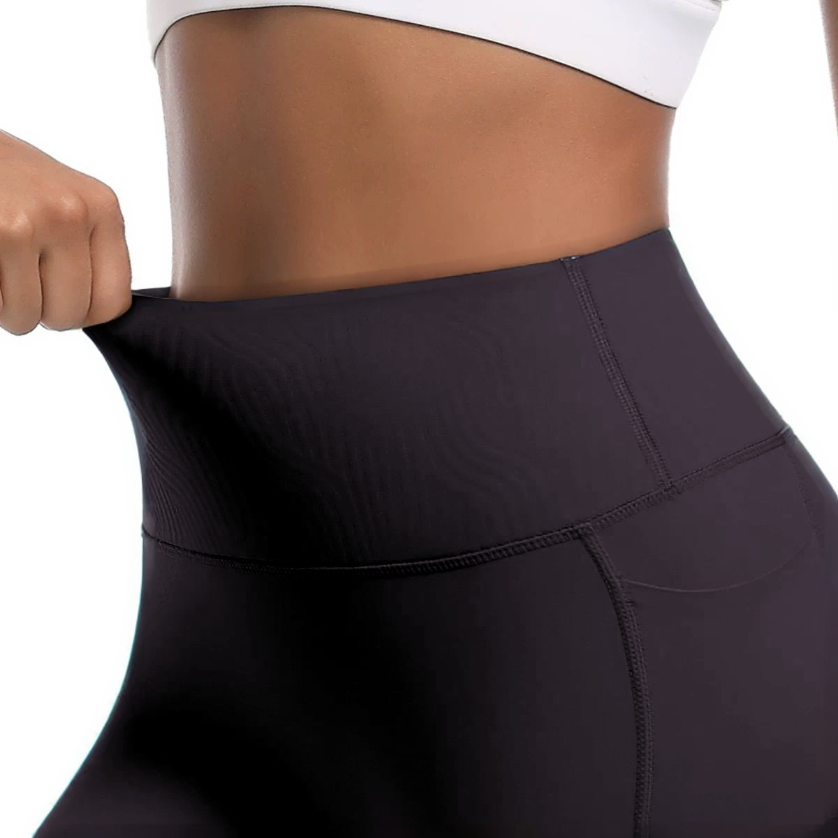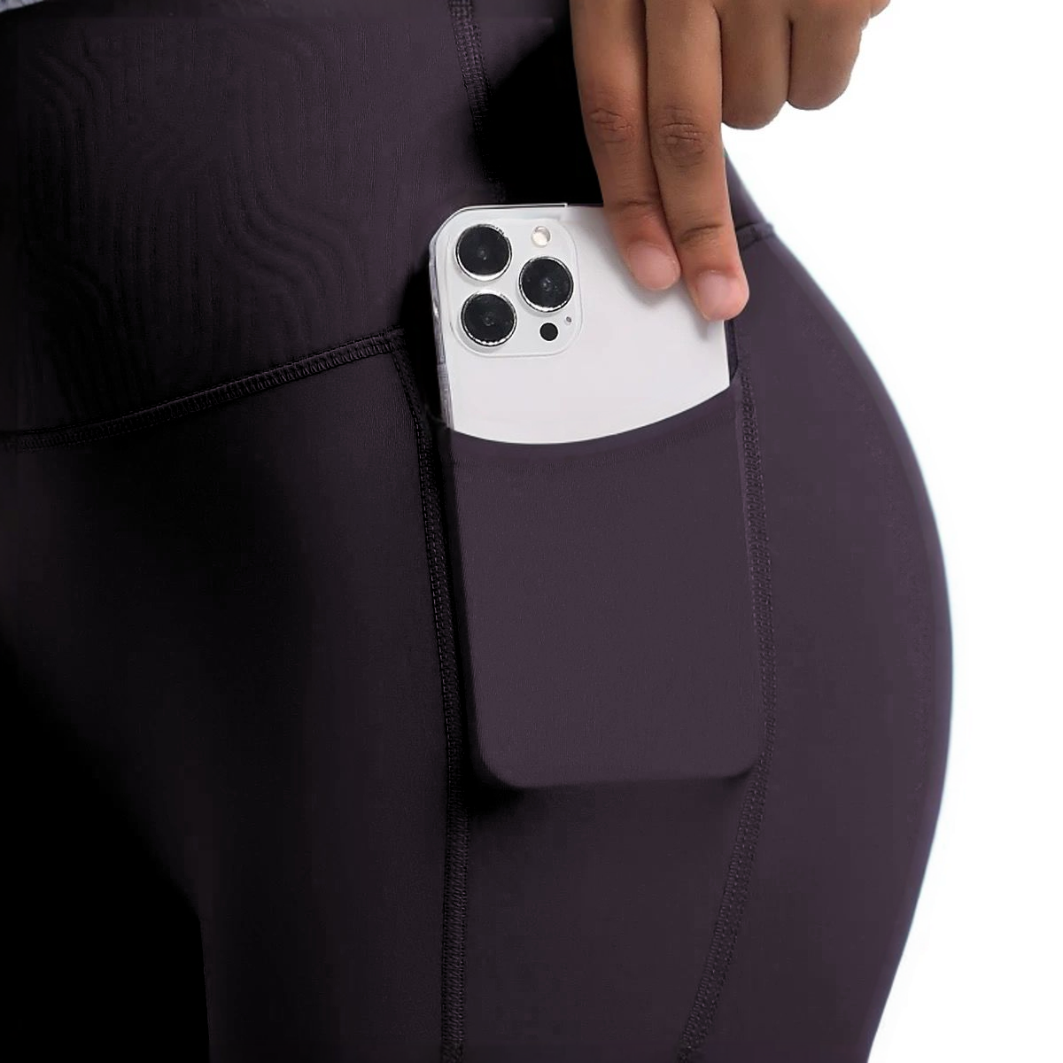 Wysoki stan, elastyczny materiał, funkcjonalna kieszonka na telefon, klasyczna czerń.