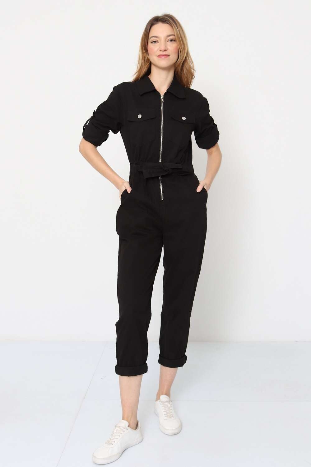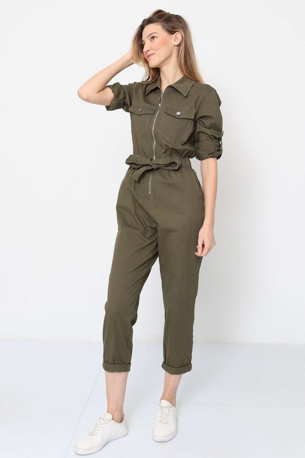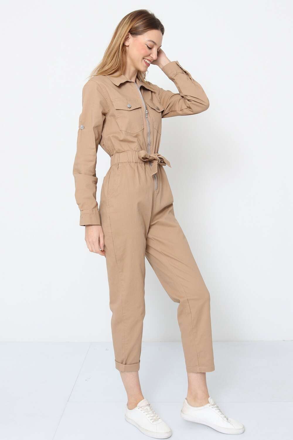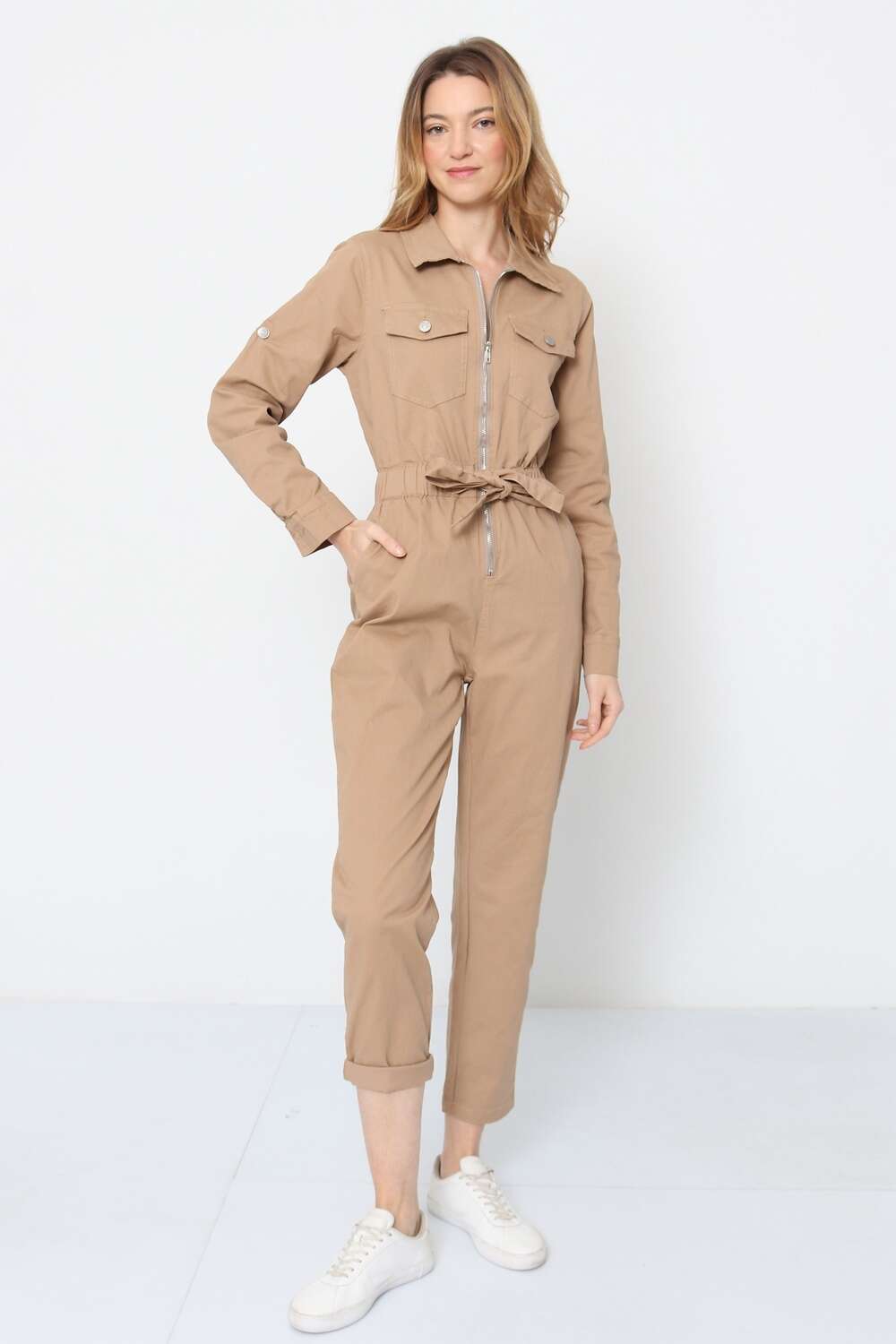 Kombinezon o swobodnym kroju z elastycznym paskiem w talii, zapinany na zamek, z praktycznymi kieszeniami i podwijanymi nogawkami. Idealny na co dzień i do pracy.