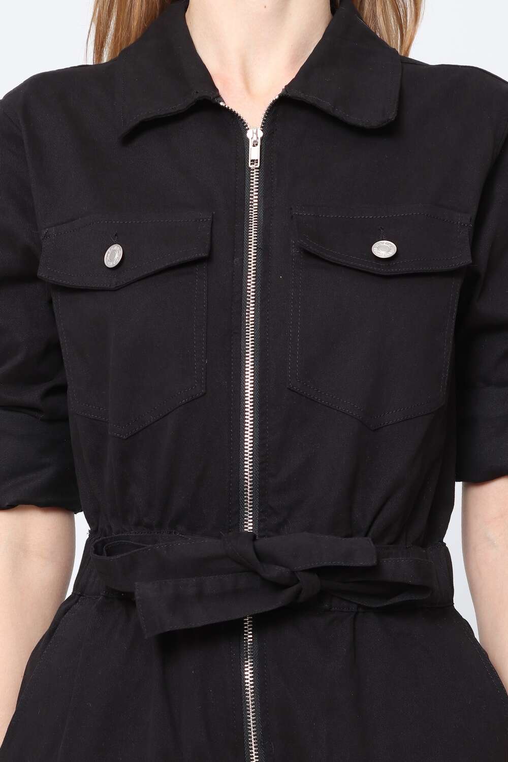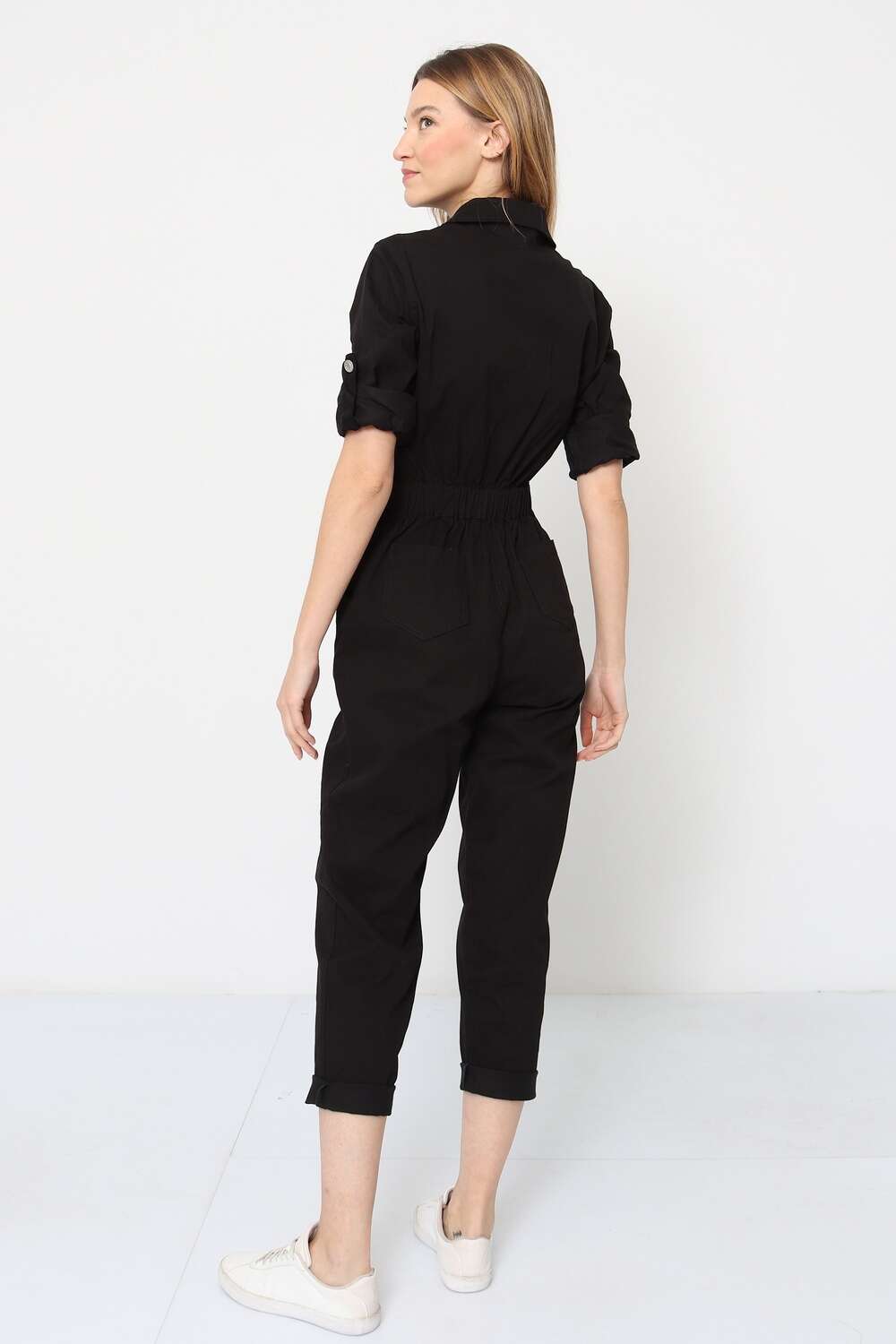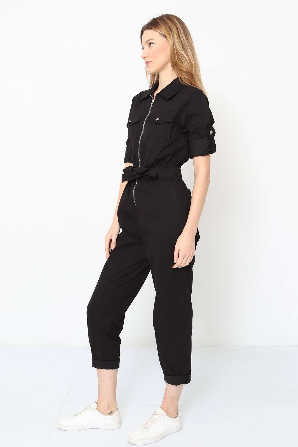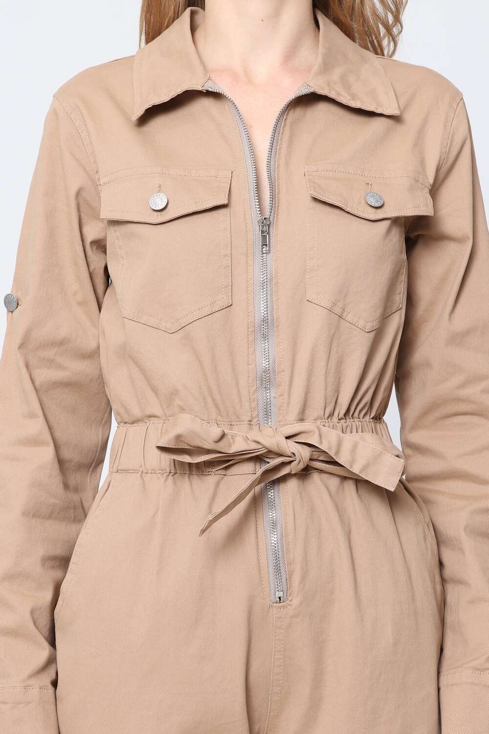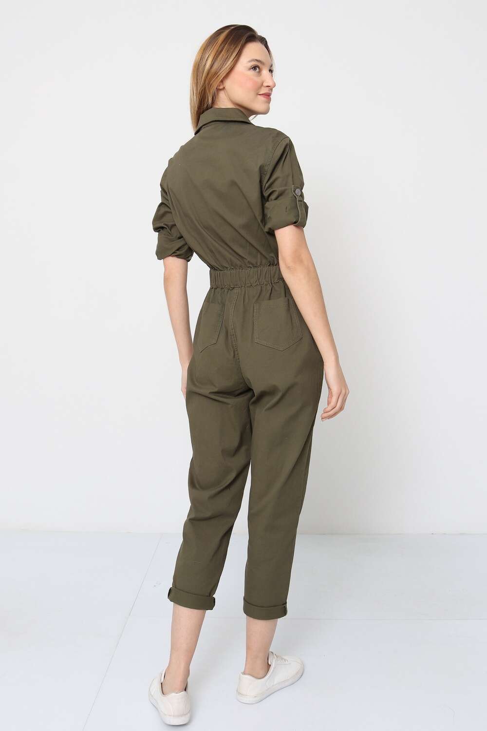 Kombinezon o swobodnym kroju z elastycznym paskiem w talii, zapinany na zamek, z praktycznymi kieszeniami i podwijanymi nogawkami. Idealny na co dzień i do pracy.