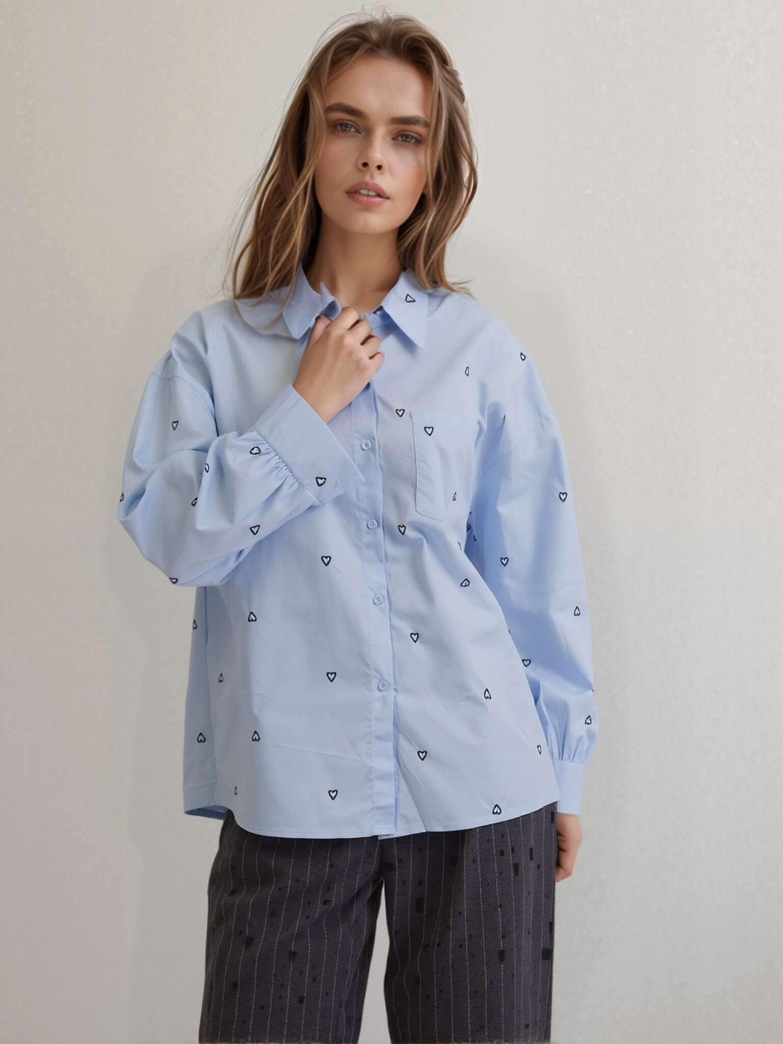Klasyczna koszula o taliowanym kroju, ozdobiona drobnym haftem serduszek. Idealna na każdą okazję, wygodna i stylowa.