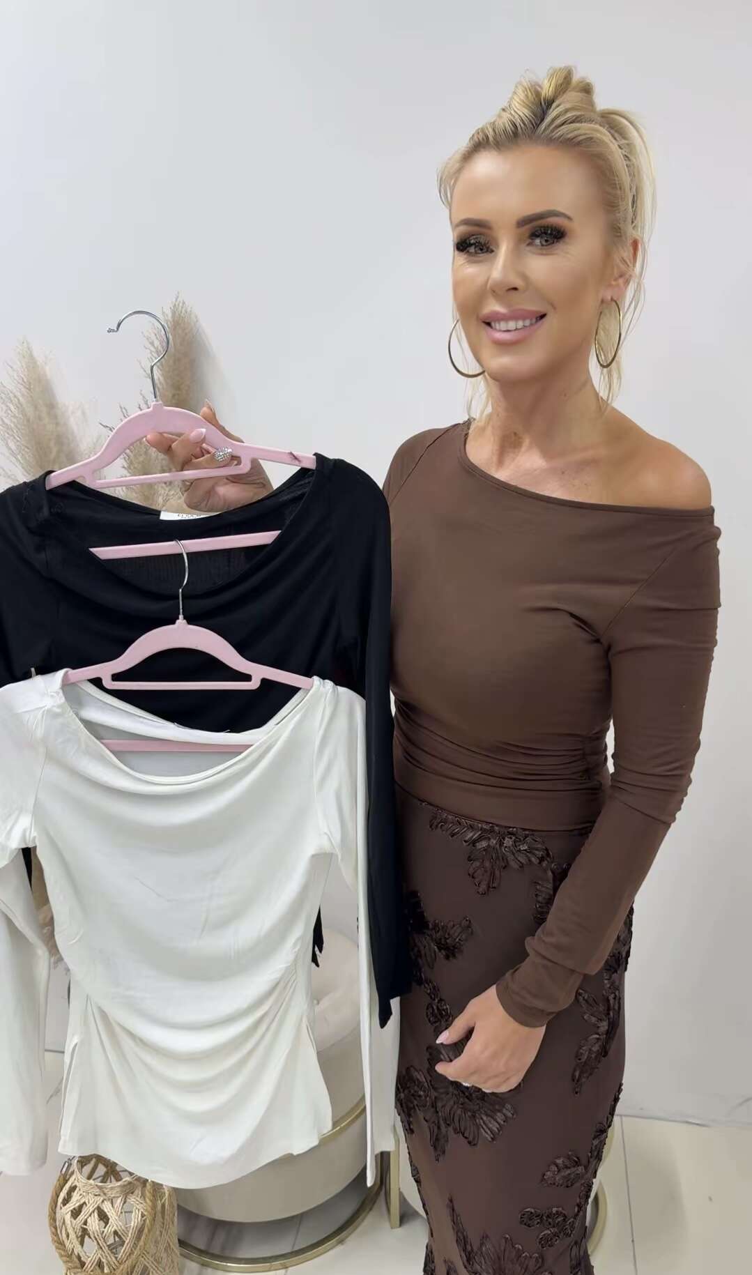 Bluzka z długim rękawem, o kobiecym fasonie, uszyta z miękkiej, elastycznej tkaniny. Efektowne marszczenia i wybór klasycznych kolorów zapewniają modny wygląd i komfort noszenia.