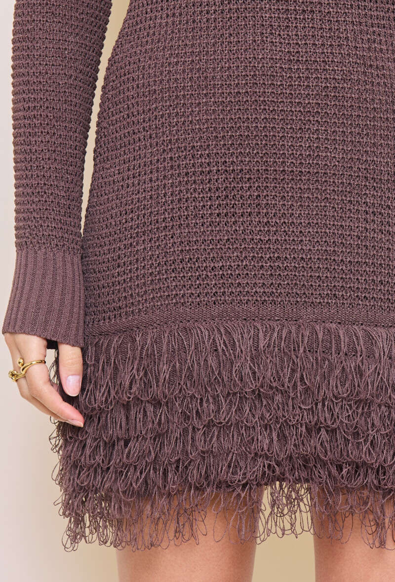 Dzianinowa sukienka z długim rękawem i wyjątkowym wykończeniem na dole. Kobiecy krój, wygoda noszenia i modny detal frędzli.