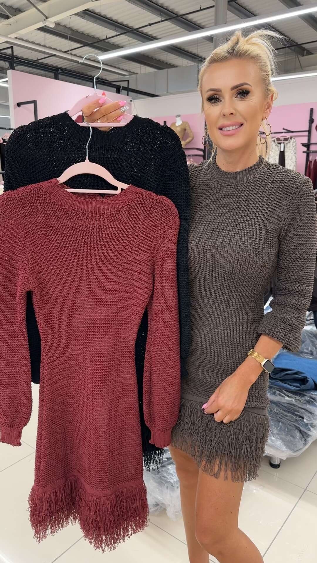 Dzianinowa sukienka z długim rękawem i wyjątkowym wykończeniem na dole. Kobiecy krój, wygoda noszenia i modny detal frędzli.