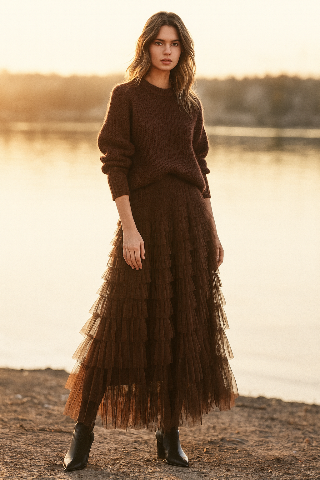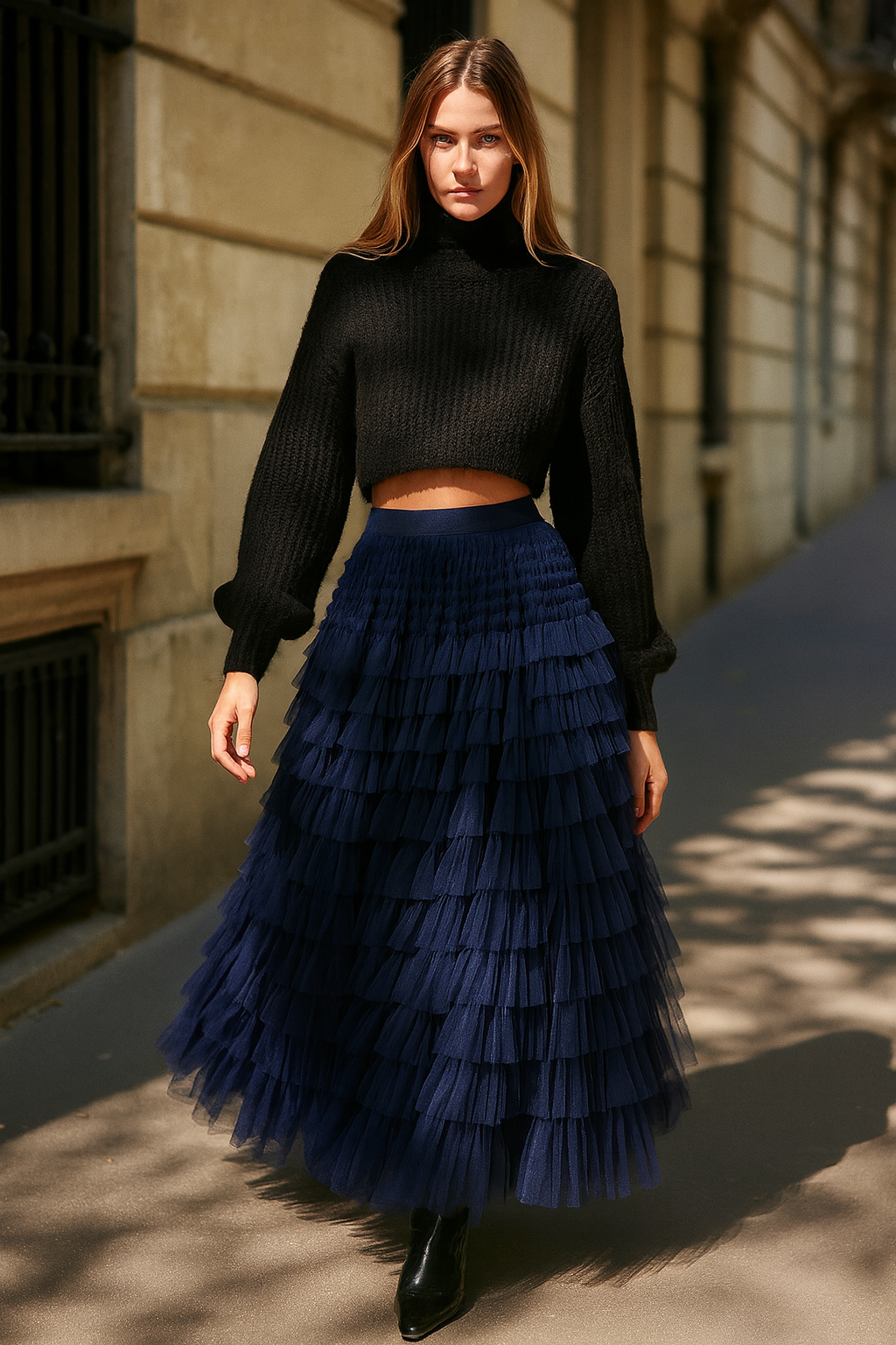 Wyjątkowy, rozkloszowany fason z falbanami, wykonany z lekkiego tiulu – modny wybór na każdą okazję.