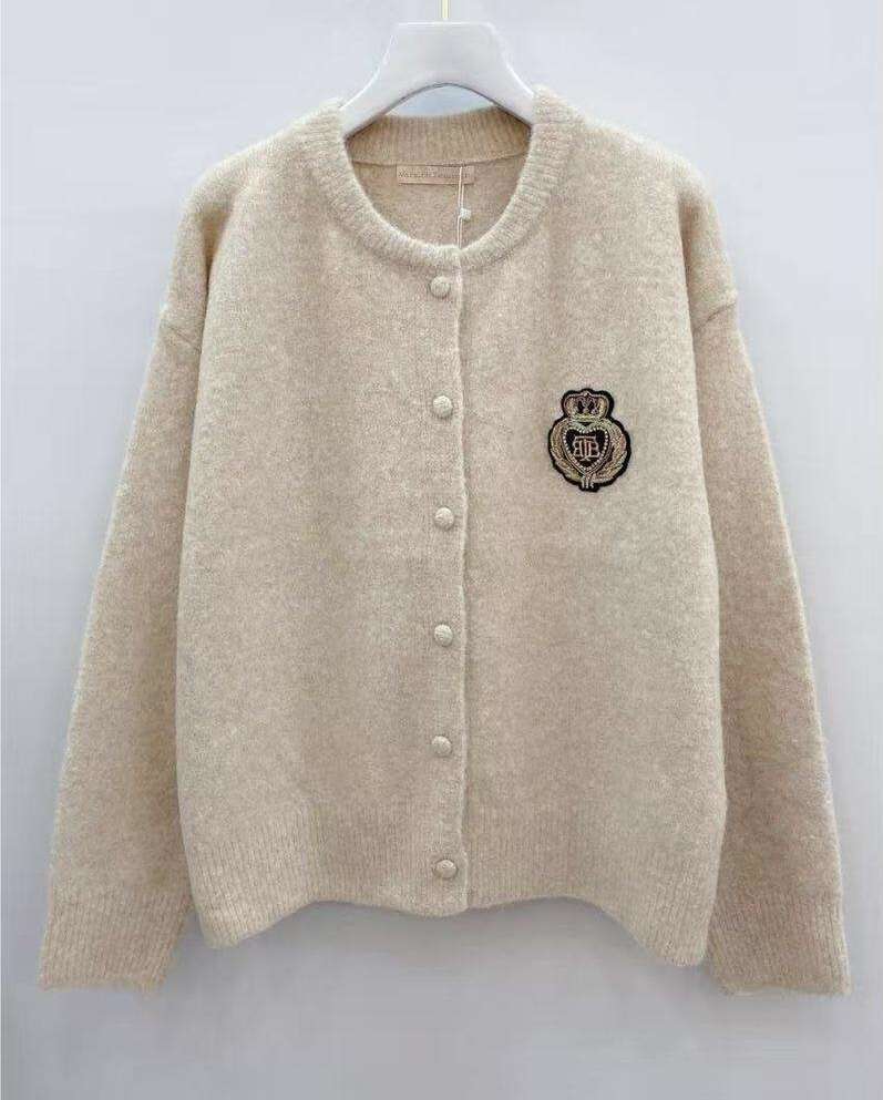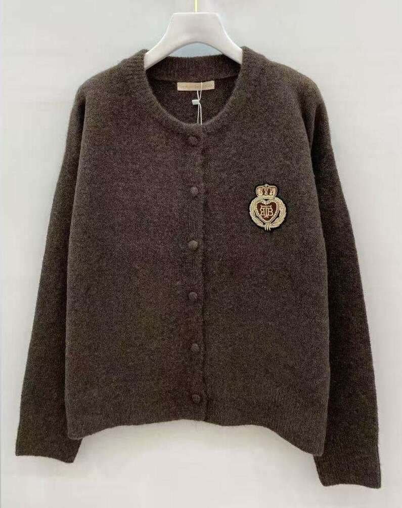 Klasyczny sweter zapinany na guziki, wykończony delikatnym haftem z emblematem. Dostępny w modnych kolorach czekoladowym i beżowym.