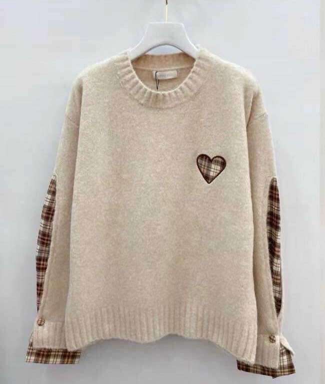 Modny, oversize sweter z uroczym, materiałowym sercem i kratkowanymi rękawami – ciepły, wygodny i stylowy.