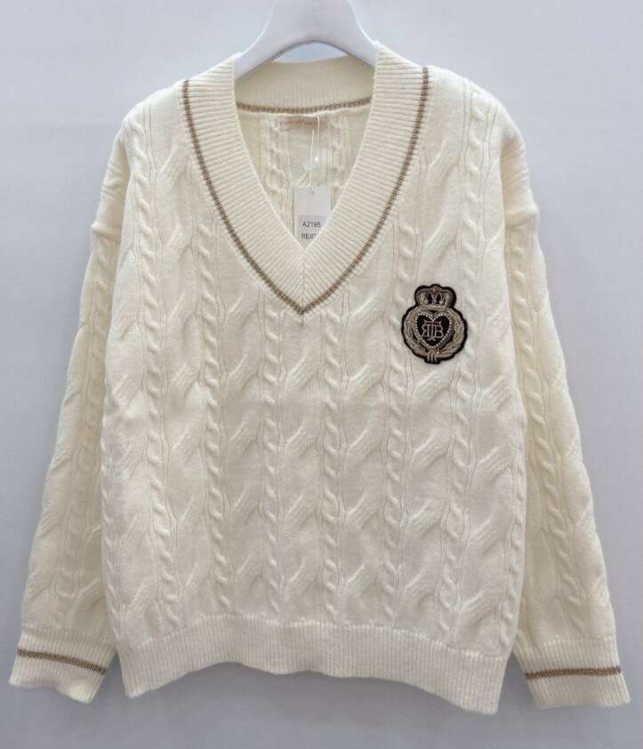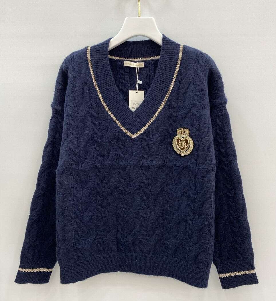Klasyczny sweter z dekoltem w serek, ozdobiony efektowną aplikacją, wykonany z miękkiej dzianiny – idealny na co dzień oraz do stylizacji smart casual.