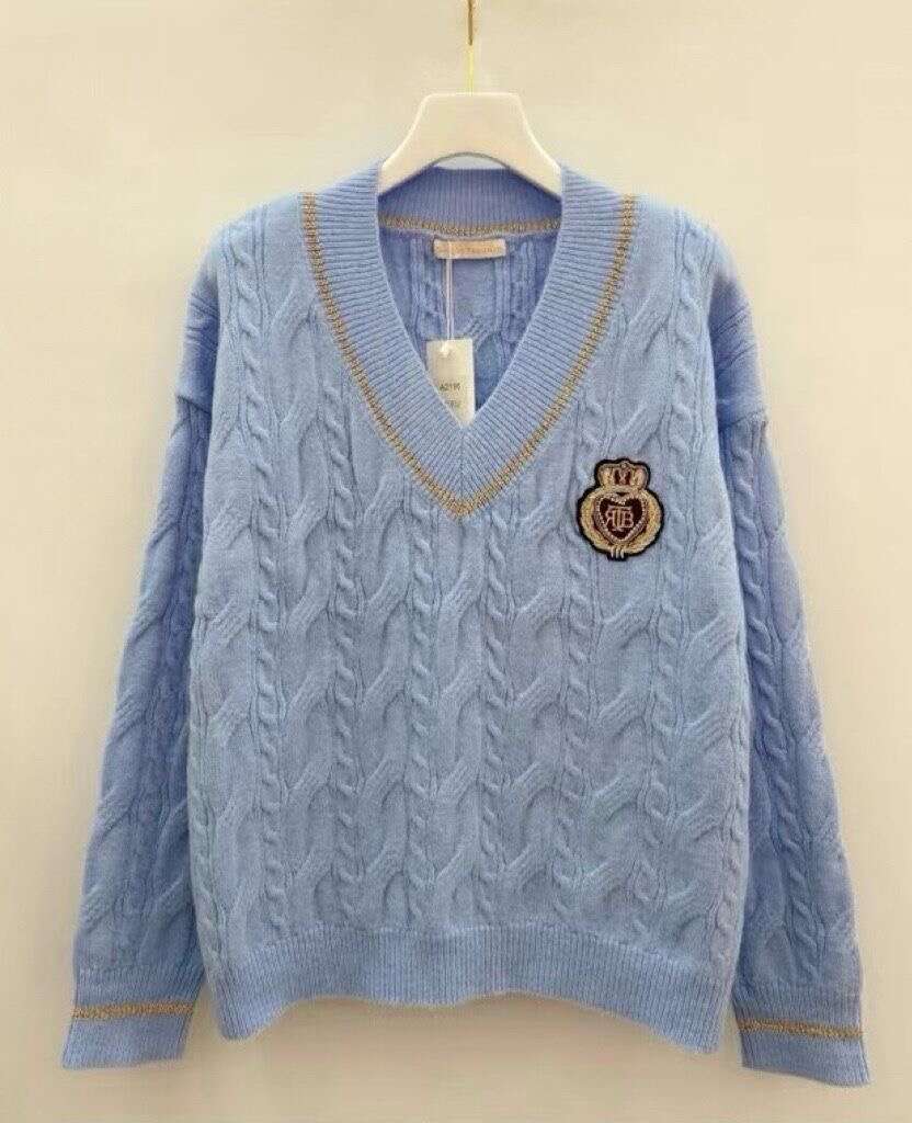 Klasyczny sweter z dekoltem w serek, ozdobiony efektowną aplikacją, wykonany z miękkiej dzianiny – idealny na co dzień oraz do stylizacji smart casual.