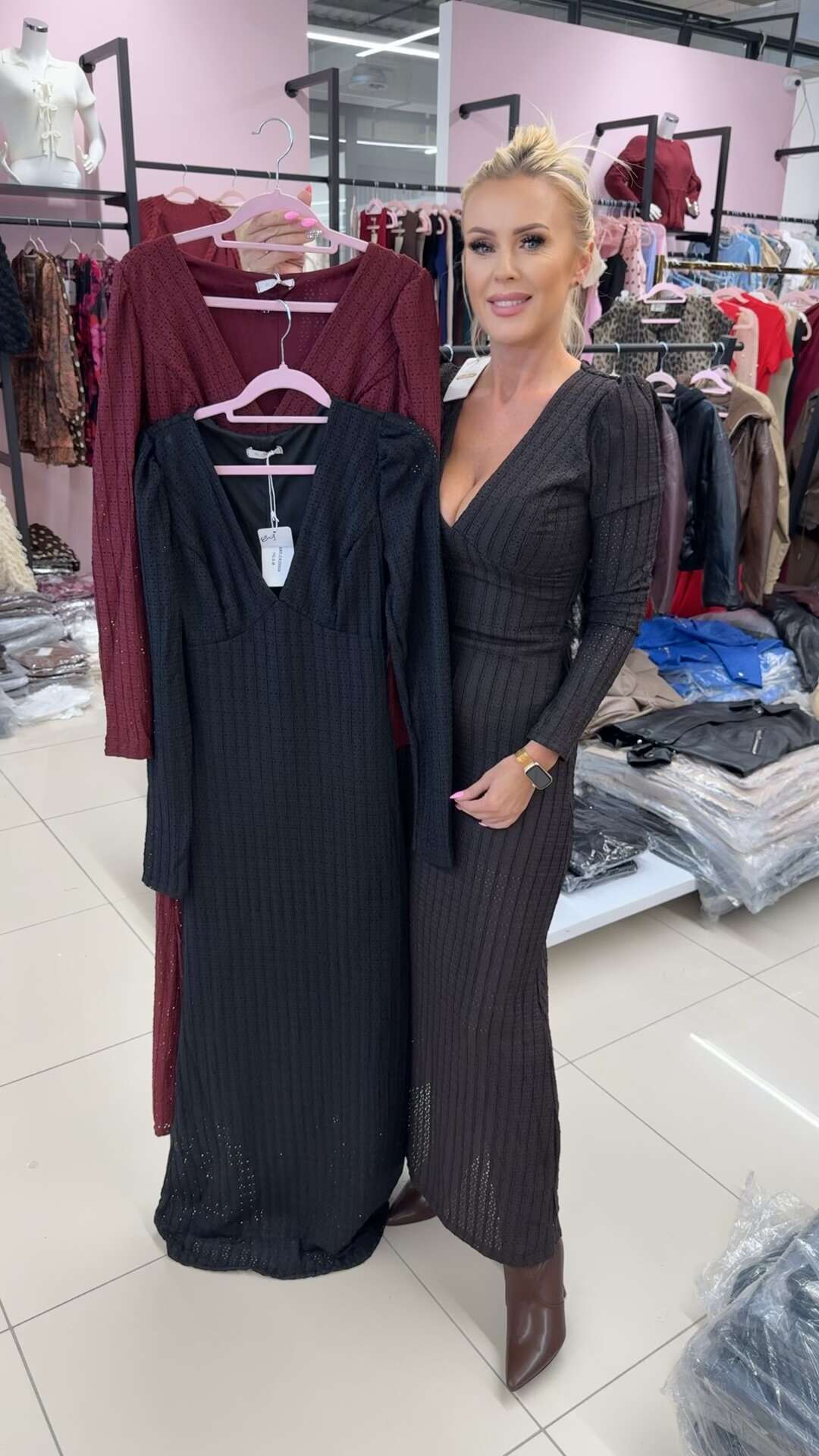 Zaproś do swojego asortymentu sukienkę, która przyciąga spojrzenia! Model maxi z głębokim dekoltem V i długimi rękawami doskonale podkreśla sylwetkę, jednocześnie zapewniając komfort noszenia przez cały dzień i wieczór. Wykonana z elastycznej, wysokogatunkowej dzianiny prążkowanej z subtelnym brokatowym połyskiem, dostępna w modnych kolorach: czekoladowym, czarnym oraz bordo. Uniwersalna długość i ponadczasowy fason sprawiają, że sukienka świetnie sprawdzi się na przyjęcia, bankiety i codzienne stylizacje. Szeroka rozmiarówka pozwoli dopasować produkt do różnych potrzeb Twoich klientek. Wzbogać swoją ofertę o model, który gwarantuje pewny, hurtowy sukces sprzedażowy!