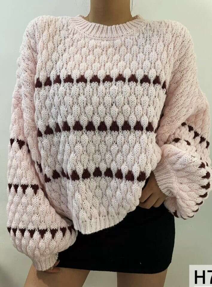 Sweter o modnym, oversize’owym kroju z efektownym splotem i geometrycznym wzorem. Maksimum komfortu i stylu na chłodne dni.