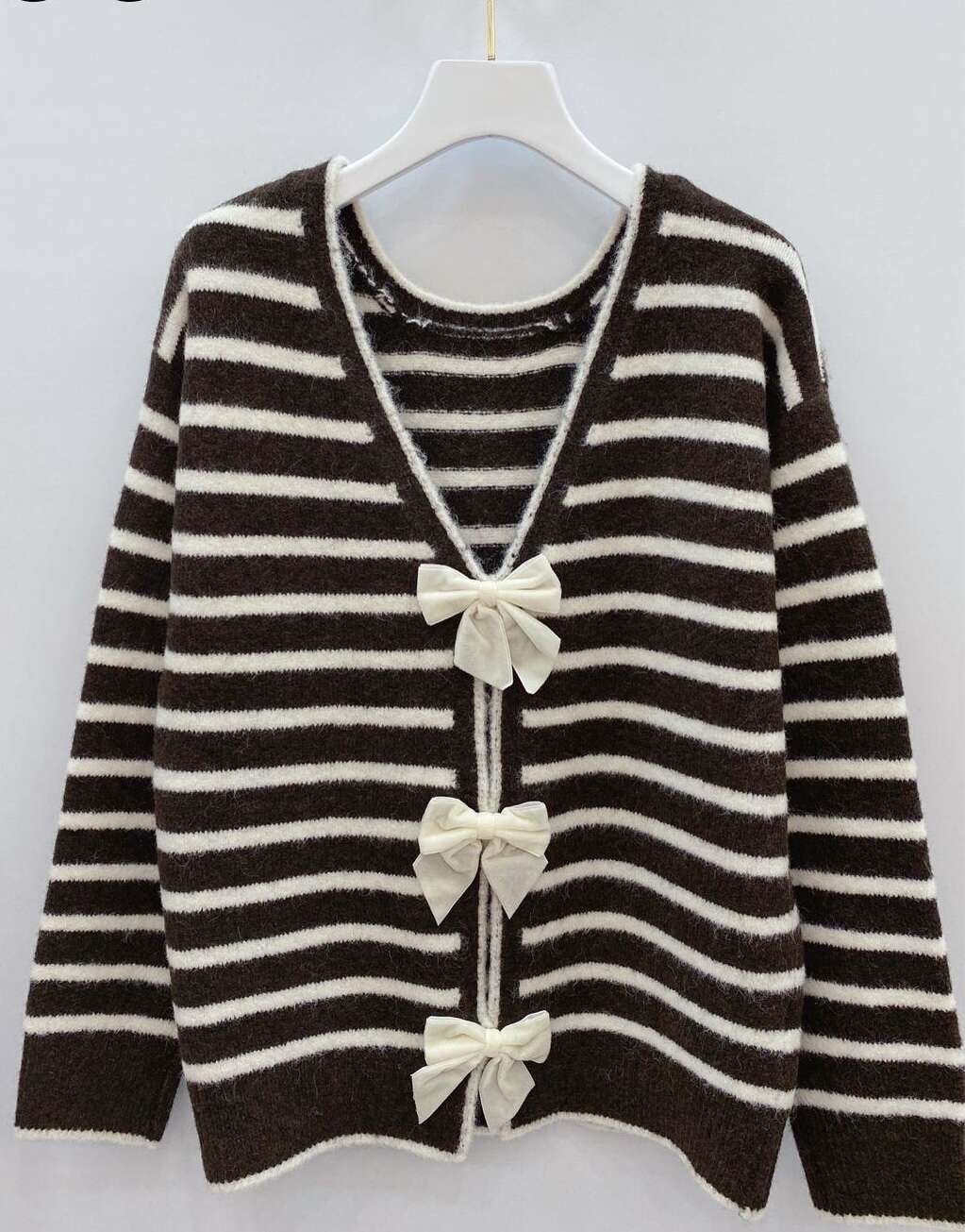 Uroczy sweter w paski z dekoracyjnymi kokardkami, miękki i wygodny – idealny do codziennych stylizacji.