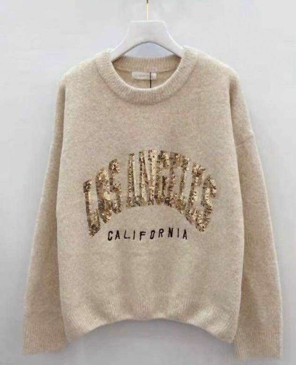Modny, oversize’owy sweter z napisem z cekinów, wykonany z miękkiego, przyjemnego materiału. Idealny na co dzień i na spotkania z przyjaciółmi.