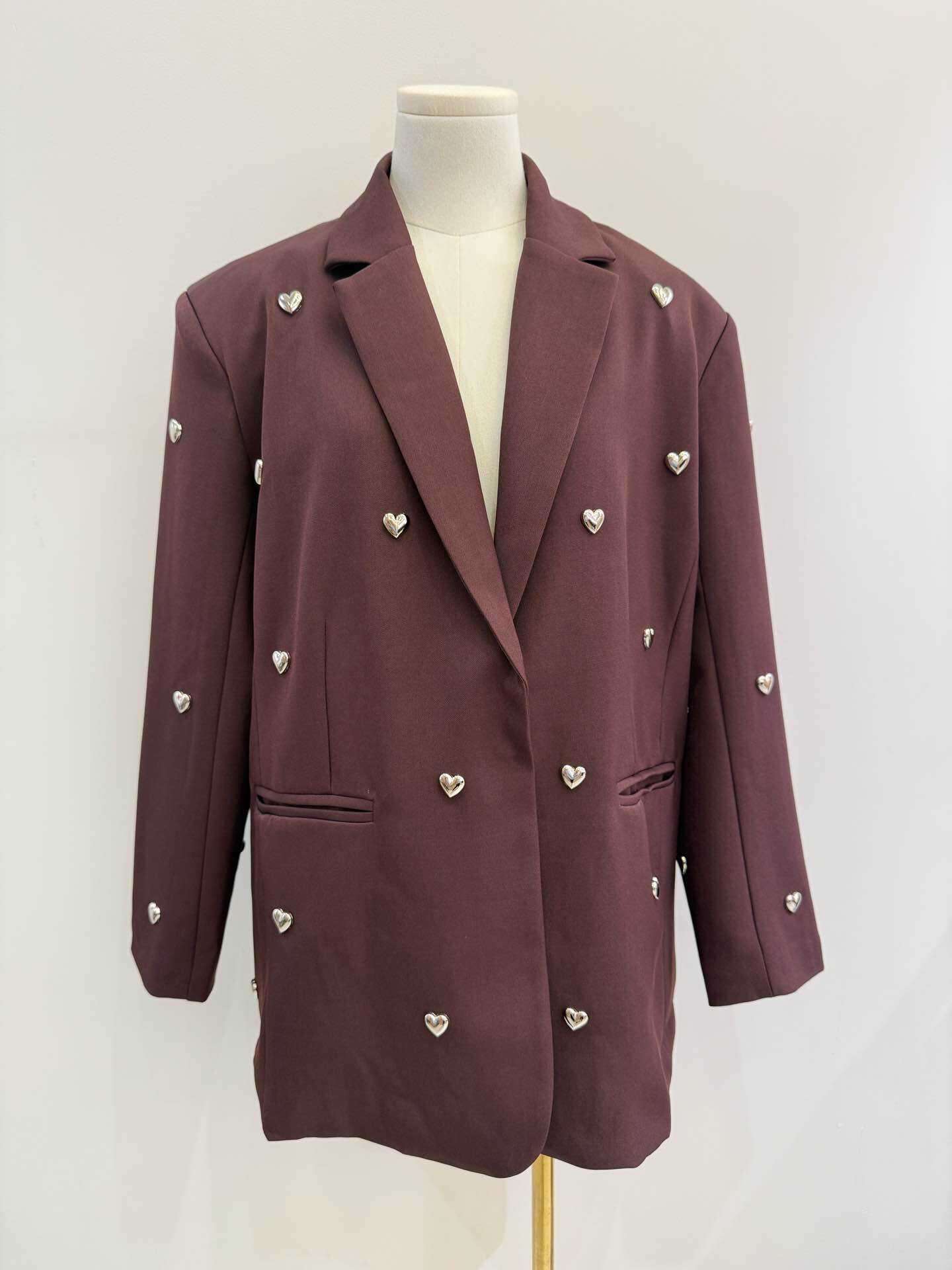Klasyczny żakiet o prostym kroju z oryginalnymi metalowymi aplikacjami w kształcie serc. Idealny miks elegancji i nowoczesnego stylu.