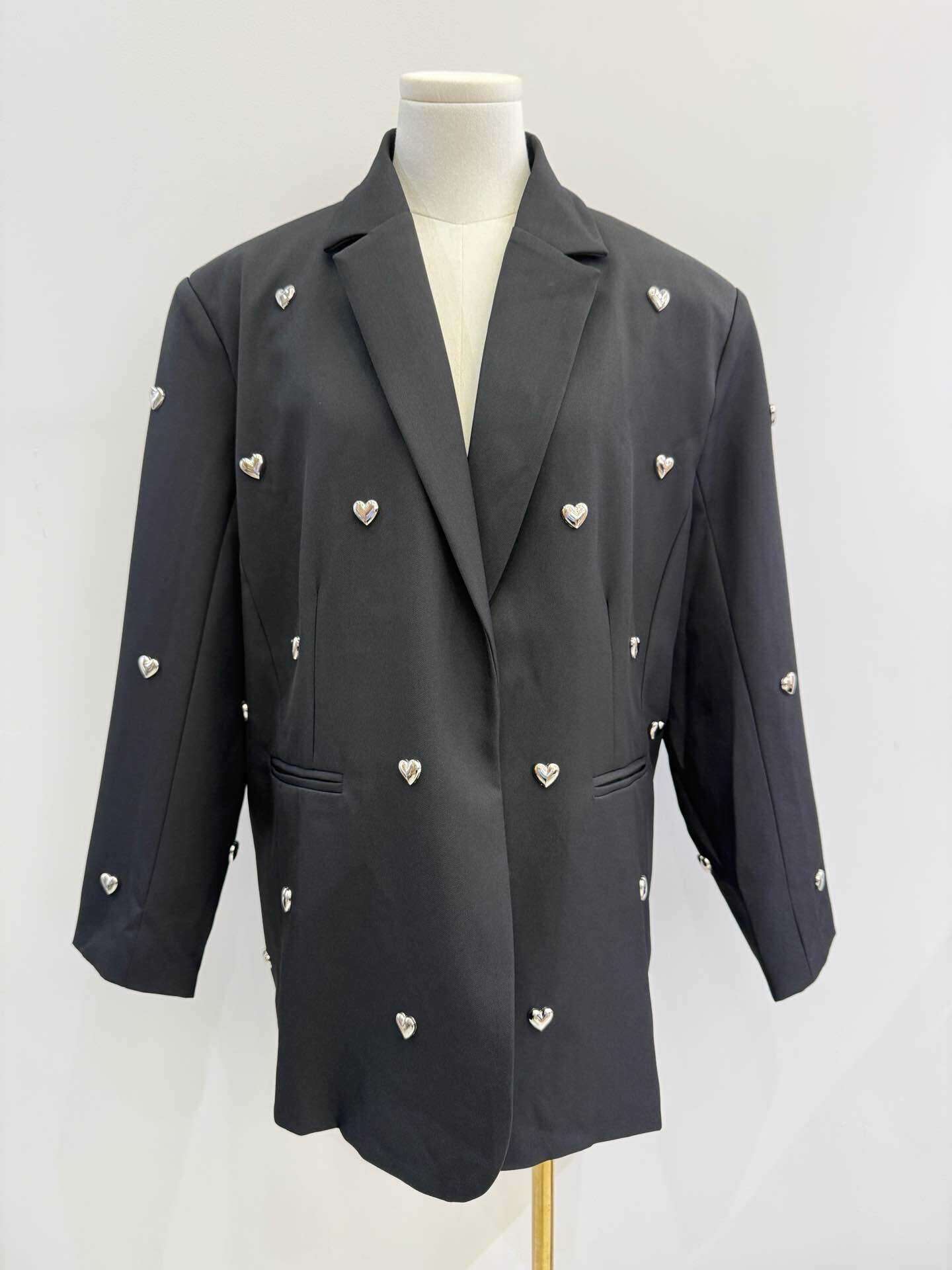 Klasyczny żakiet o prostym kroju z oryginalnymi metalowymi aplikacjami w kształcie serc. Idealny miks elegancji i nowoczesnego stylu.