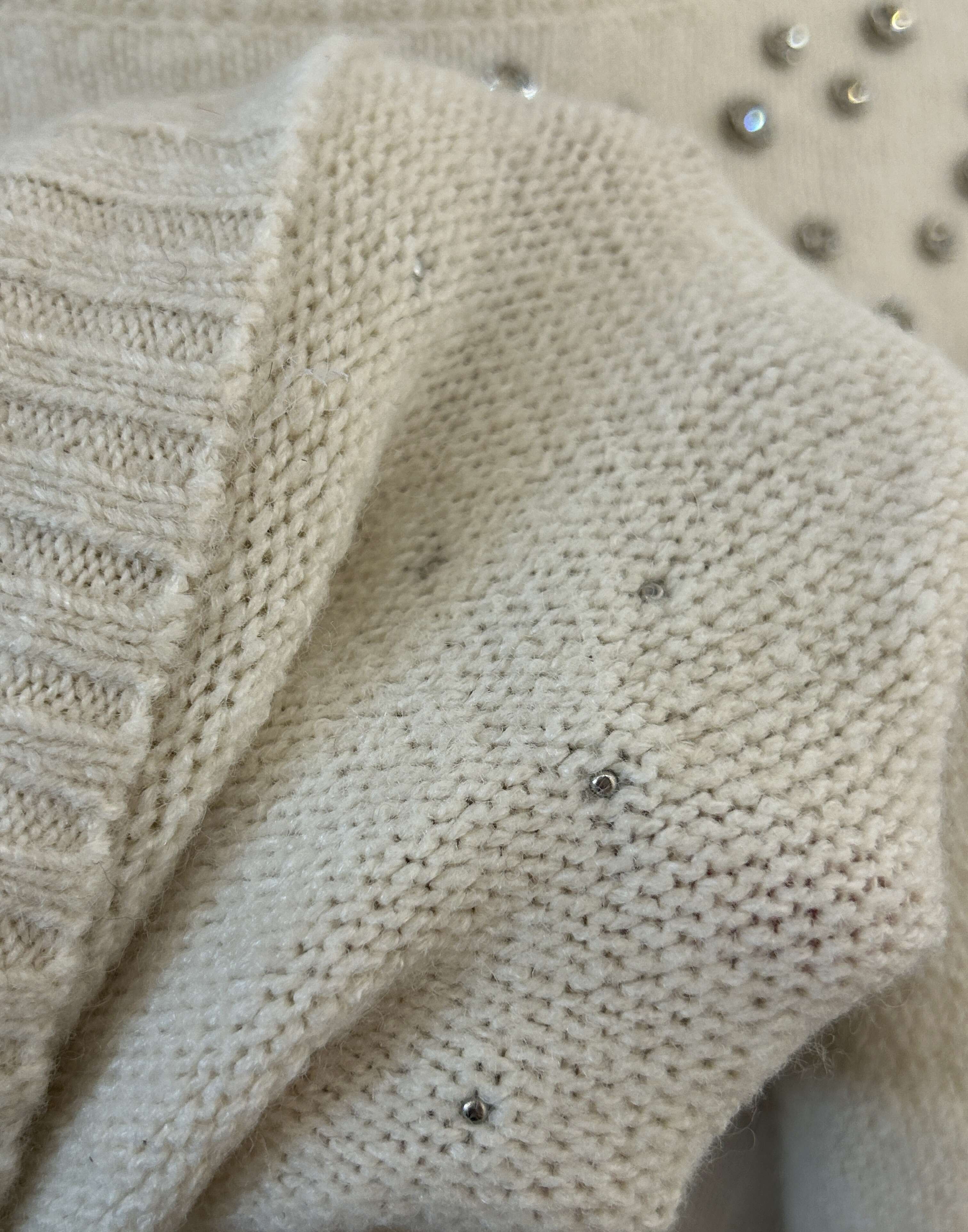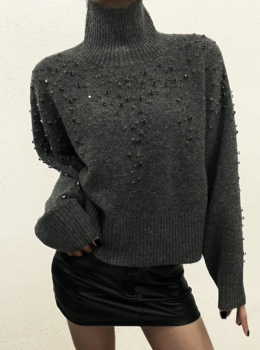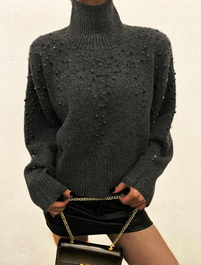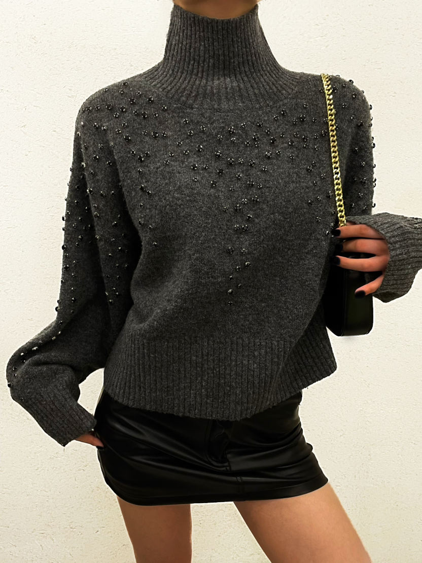 Sweter z wysokim golfem, zdobiony drobnymi perełkami, miękki i stylowy – idealny do eleganckich oraz codziennych stylizacji.