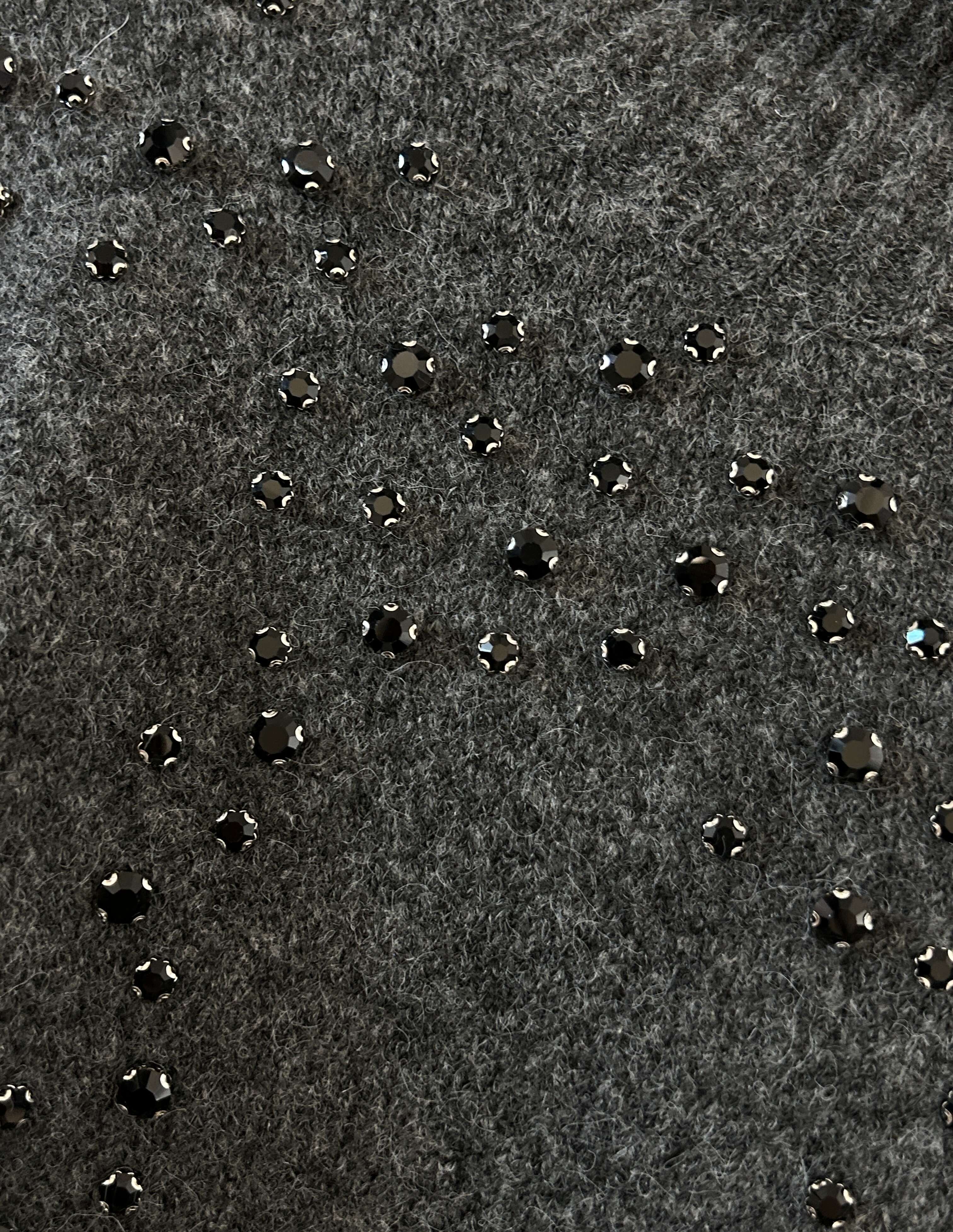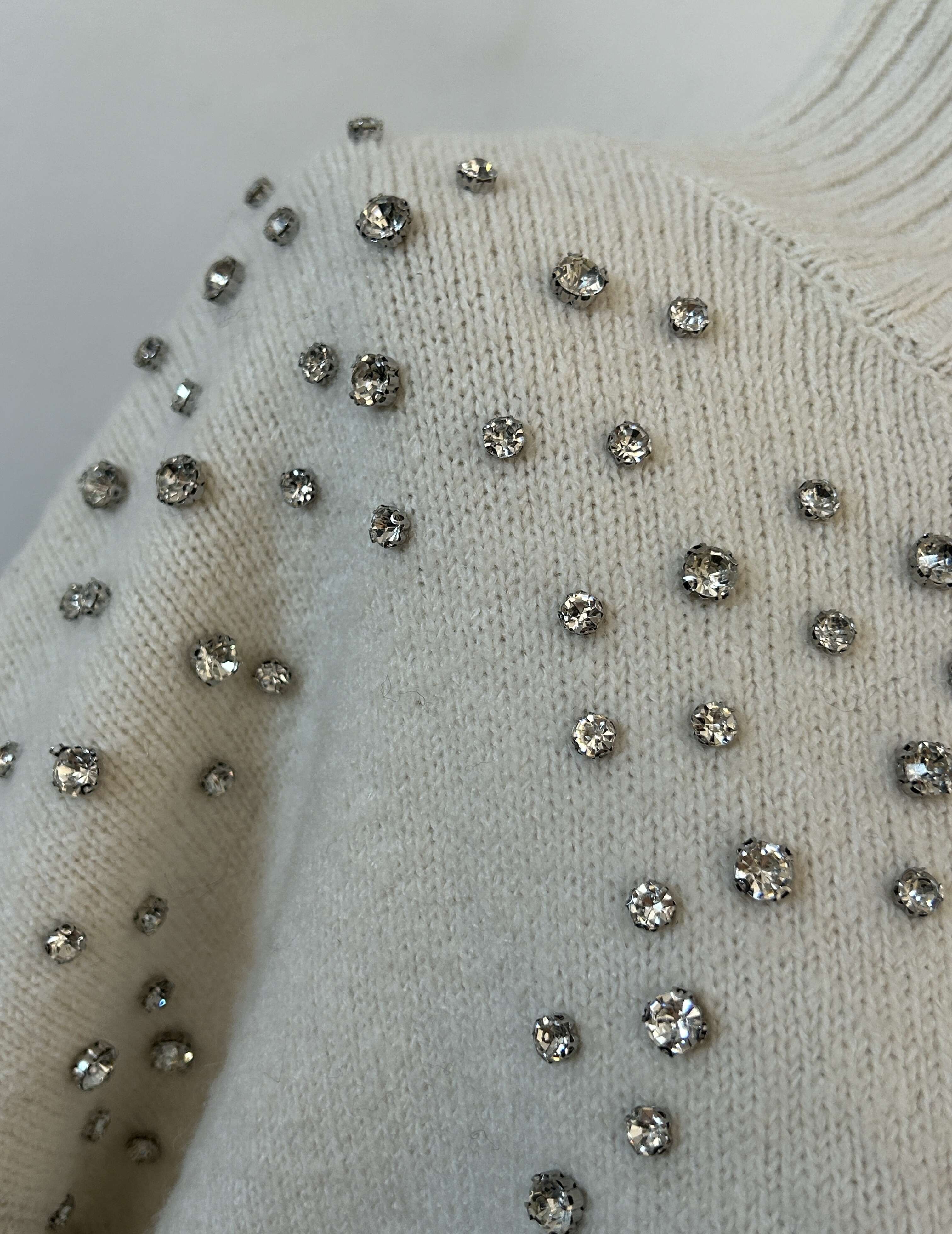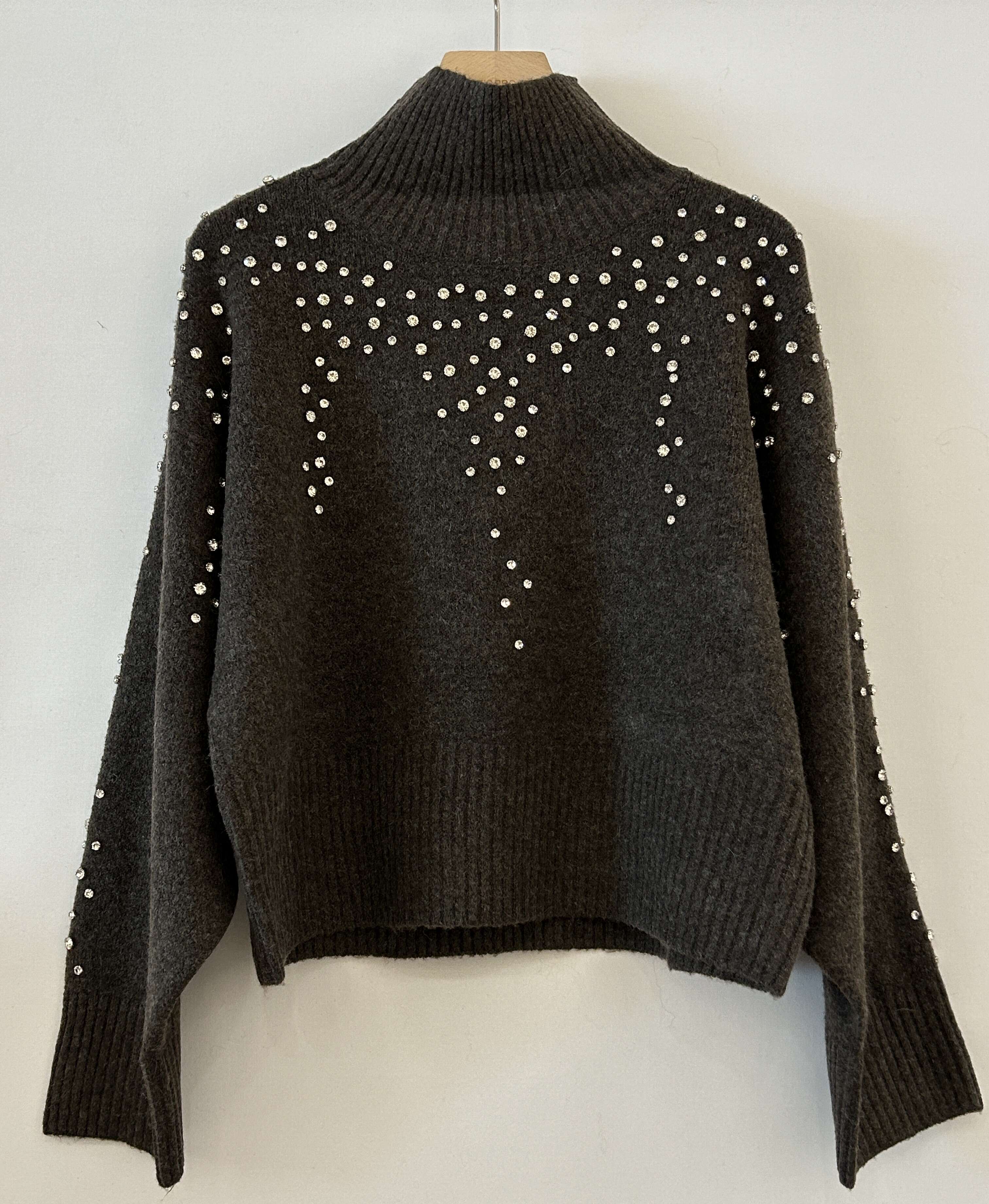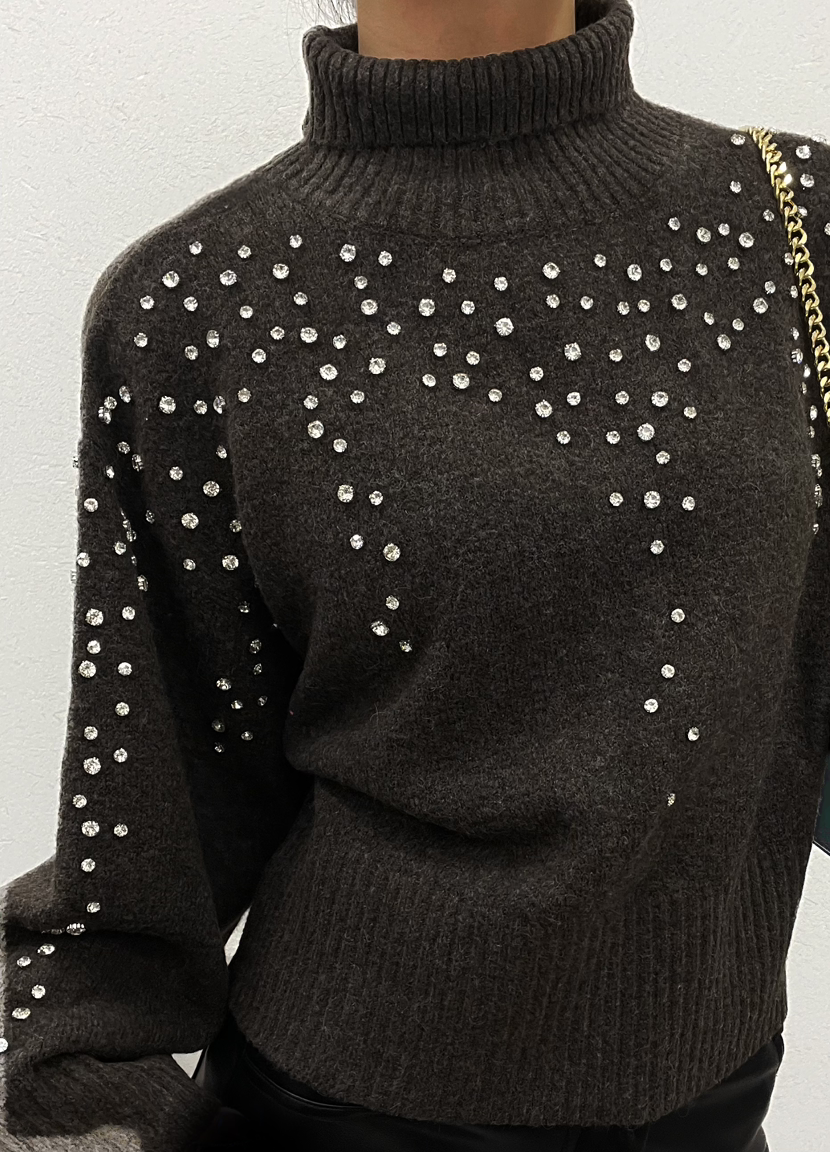 Sweter z wysokim golfem, zdobiony drobnymi perełkami, miękki i stylowy – idealny do eleganckich oraz codziennych stylizacji.