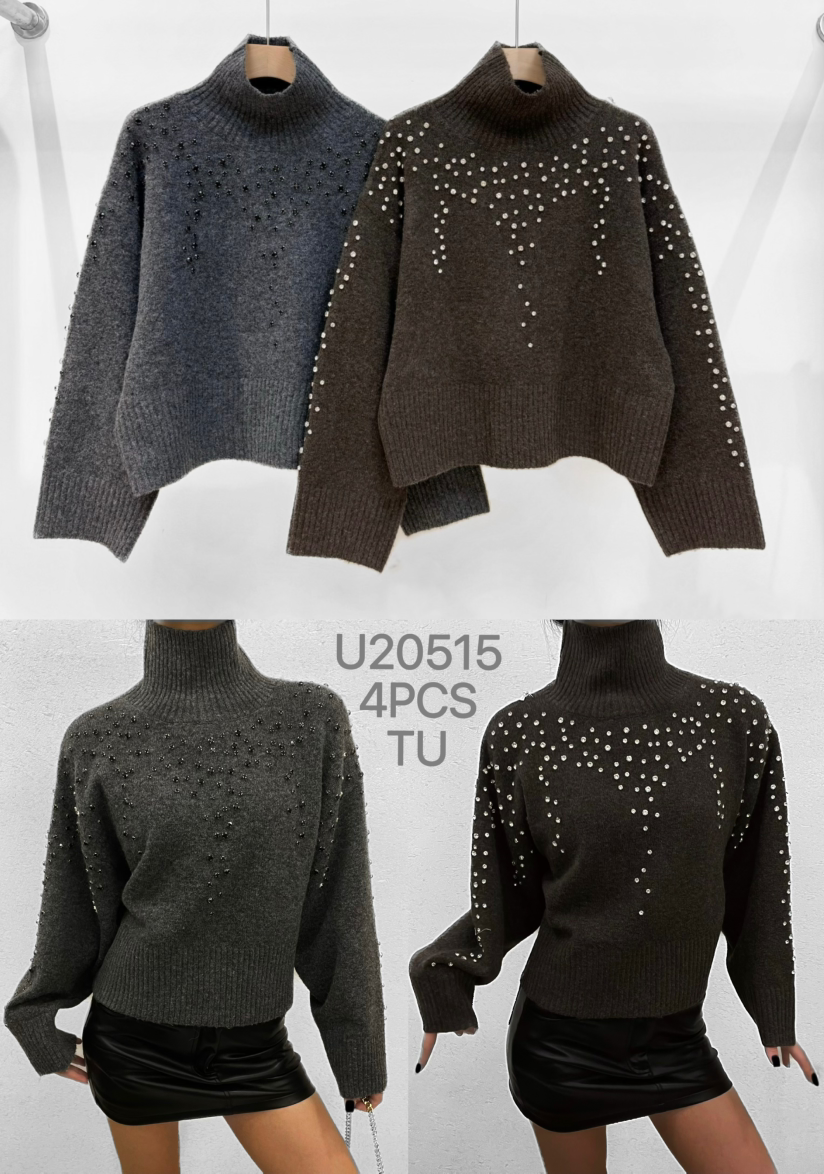 Swetry AROHA to wyjątkowa propozycja dla butików ceniących połączenie wygody i stylu. Model wyróżnia się ozdobnymi koralikami rozmieszczonymi na całej powierzchni, dodając blasku każdej stylizacji. Dostępny w uniwersalnych kolorach: szarym, ecru oraz czekoladowym, pozwala na stworzenie zróżnicowanej oferty w kolekcji sklepu. Sweter o luźnym fasonie i wysokim, miękkim golfie wykonany został z wysokiej jakości, przyjemnej w dotyku przędzy. Doskonały zarówno na co dzień, jak i na wieczorne wyjścia – świetnie komponuje się z jeansami, spódnicami czy eleganckimi spodniami. Idealny do sprzedaży hurtowej dla sklepów stawiających na nowoczesną modę damską.