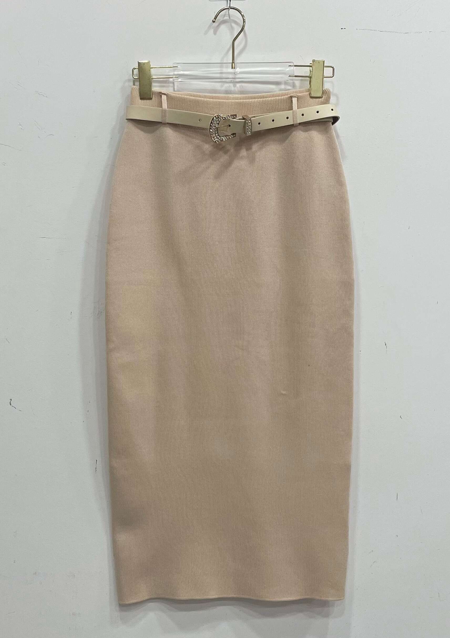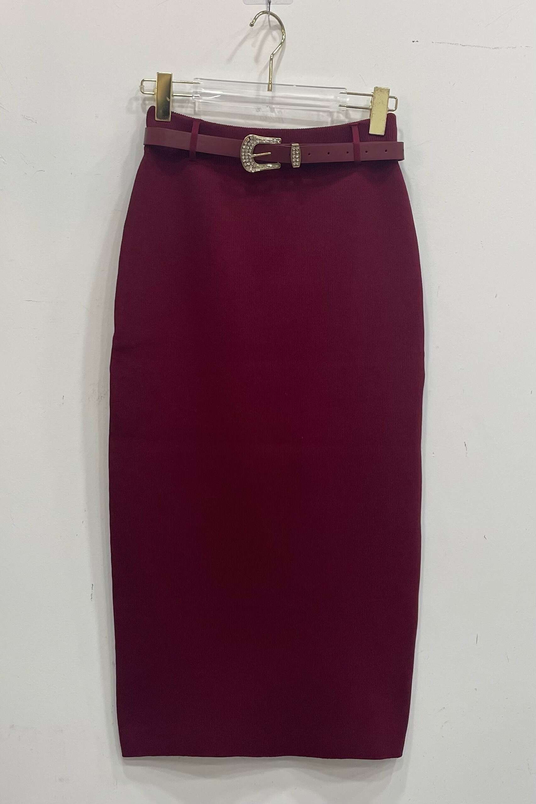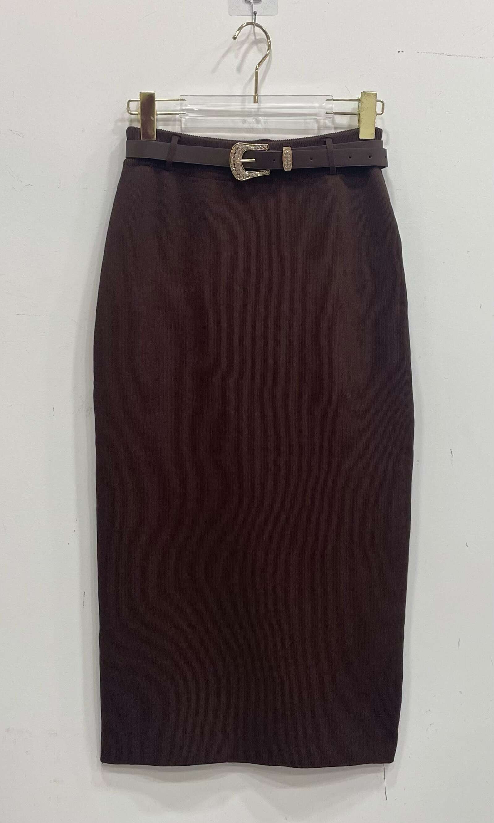 Klasyczna spódnica o dopasowanym kroju z eleganckim paskiem i ozdobną klamrą – komfortowa baza każdej stylizacji.