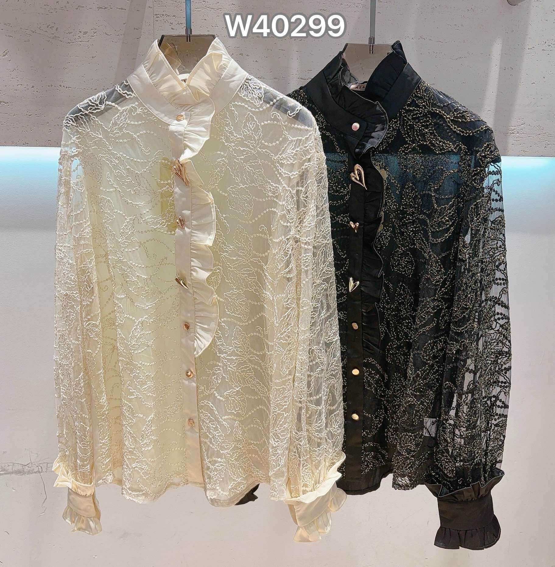 Transparentny materiał z delikatnym haftem, ozdobne falbany i eleganckie zapięcie na guziki — wyjątkowa stylizacja na każdą okazję.