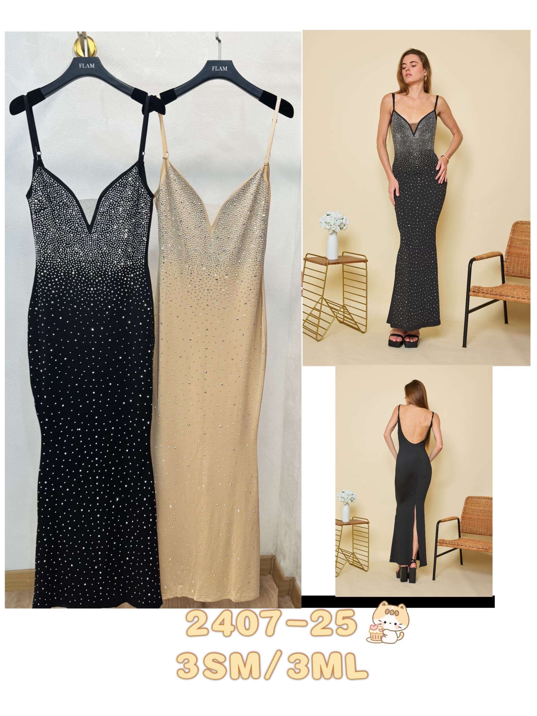 Długa, czarna sukienka o dopasowanym kroju z efektownym dekoltem i błyszczącymi aplikacjami.