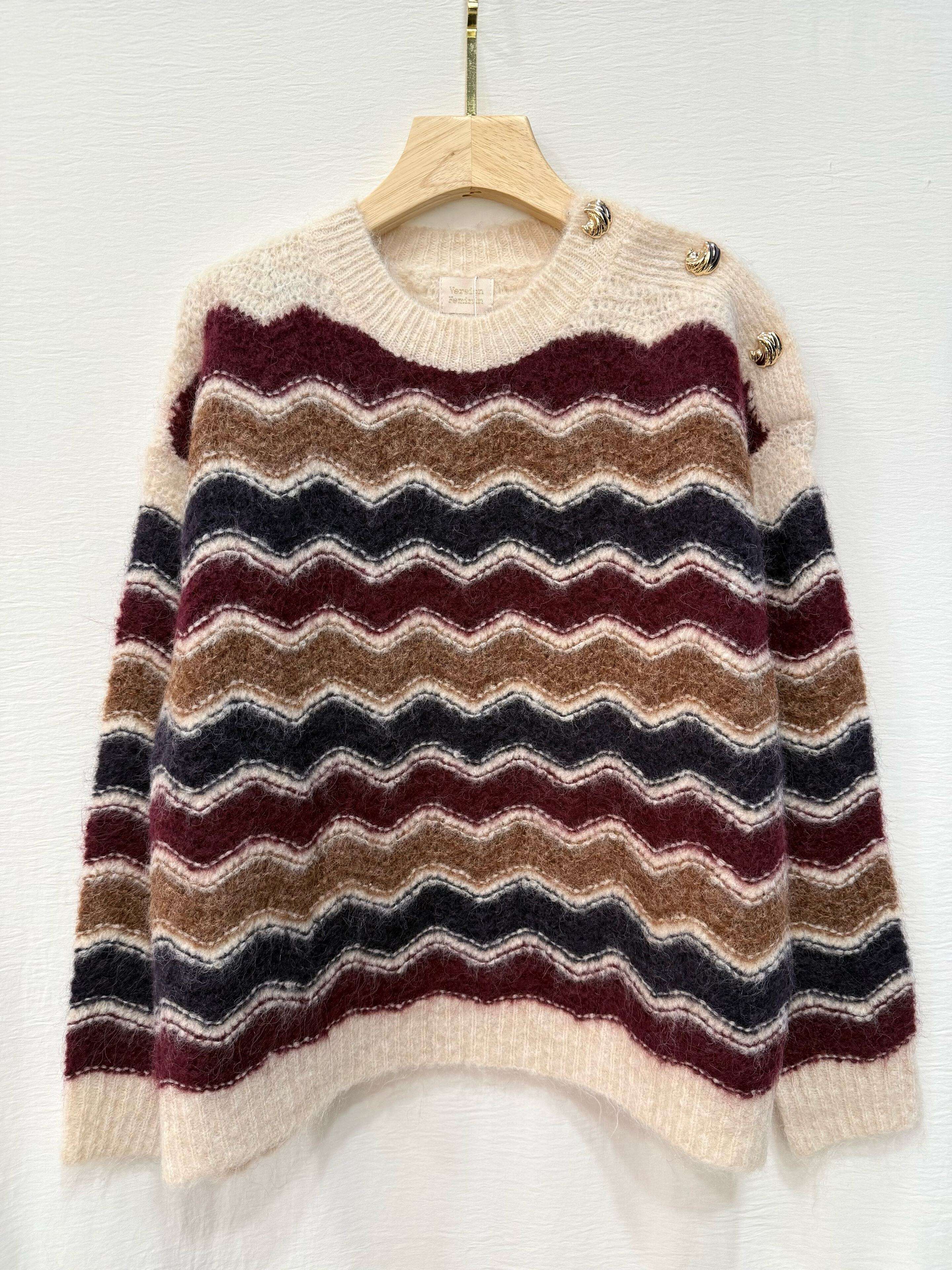 Stylowy sweter o luźnym kroju z modnym, falistym wzorem w odcieniach czekolady i beżu. Miękki, przyjemny w dotyku materiał oraz ozdobne guziki na ramieniu.