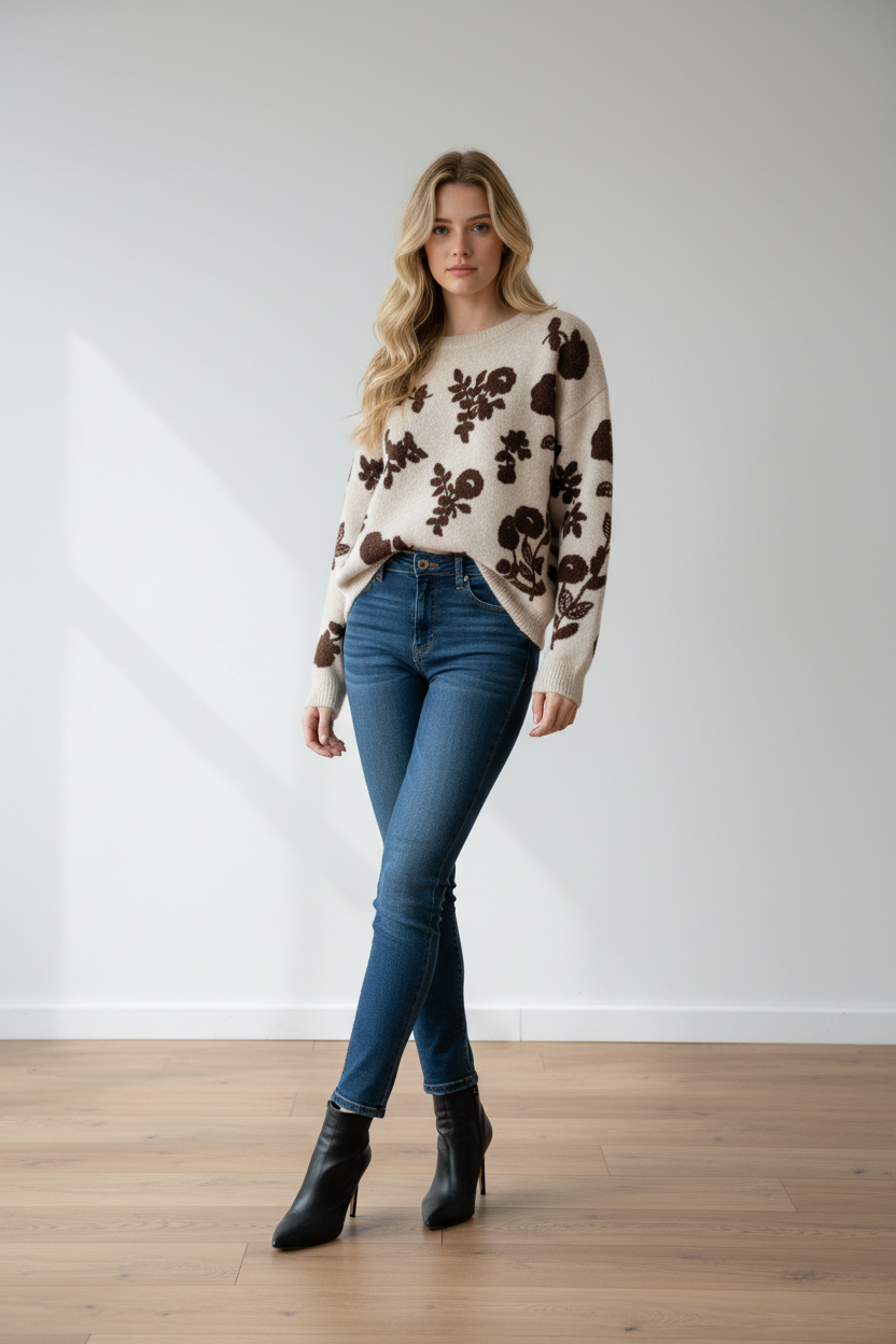 Sweter o luźnym kroju z miękkiego materiału, ozdobiony modnym roślinnym wzorem w dwóch stylowych kolorach – czekoladowym i bordo.