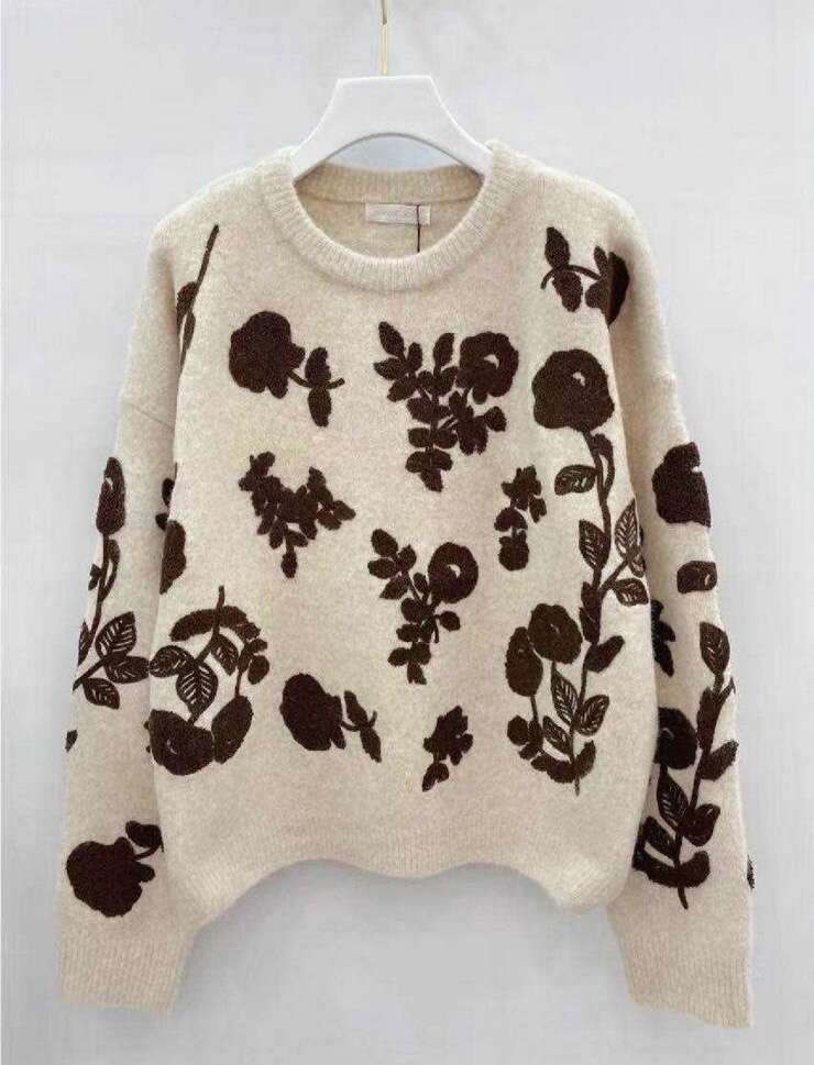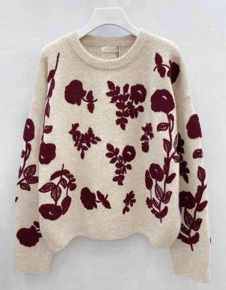 Sweter o luźnym kroju z miękkiego materiału, ozdobiony modnym roślinnym wzorem w dwóch stylowych kolorach – czekoladowym i bordo.