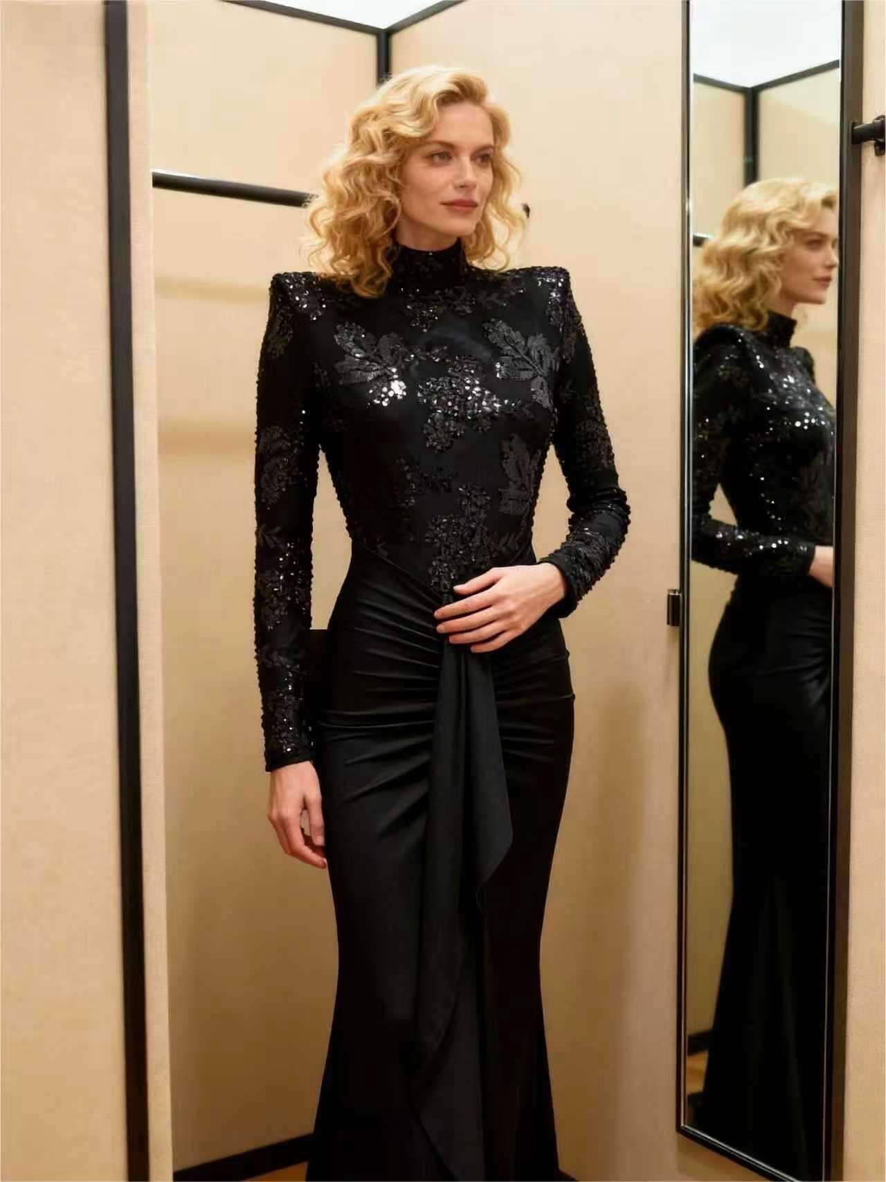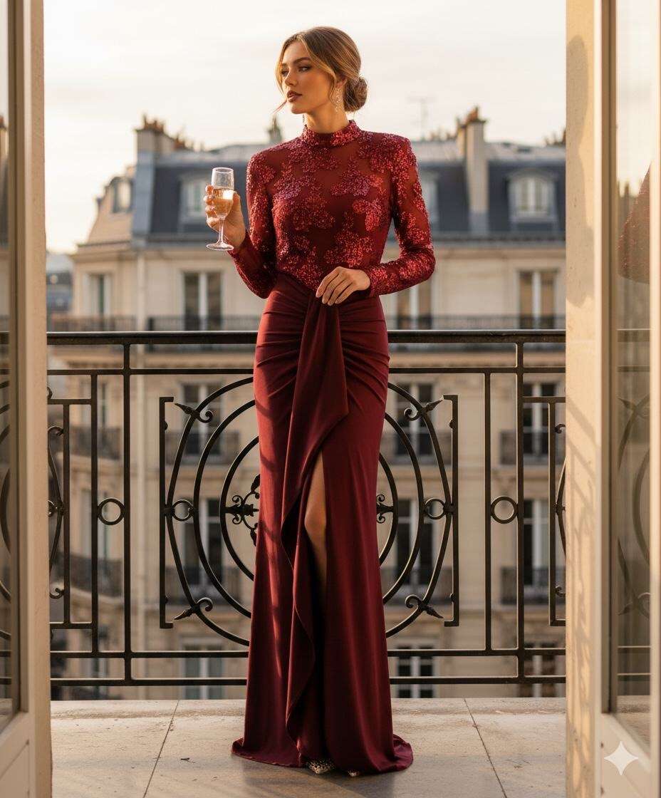 Olśniewająca długa sukienka z elegancką koronkową górą, efektownymi marszczeniami i kobiecym krojem podkreślającym sylwetkę.