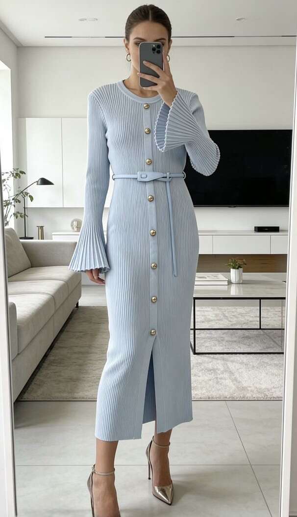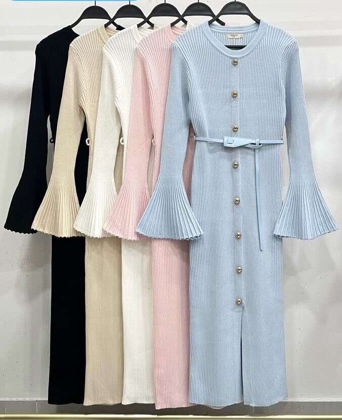 Wzbogać swoją ofertę o sukienkę, która zachwyca stylem i komfortem noszenia. Model wykonany z wysokiej jakości, elastycznego materiału doskonale podkreśla sylwetkę i zapewnia wygodę nawet przez cały dzień. Sukienka wyróżnia się modnymi rozkloszowanymi rękawami oraz ozdobnymi guzikami na całej długości, a pasek w talii pięknie modeluje figurę. Dostępna w czterech hitowych kolorach: czekoladowym, czarnym, bordowym oraz beżowym – to propozycja uniwersalna, sprawdzi się zarówno w stylizacjach na co dzień, jak i podczas wyjątkowych wydarzeń. Idealna do sprzedaży hurtowej dla klientów poszukujących ponadczasowej klasyki i nowoczesnych detali w jednym produkcie. Różnorodność rozmiarów umożliwi dopasowanie do różnych typów sylwetek, gwarantując zadowolenie klientek.