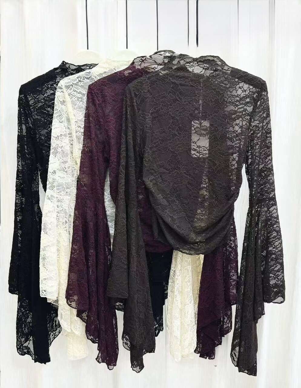 Koronkowa bluzka z długimi, rozkloszowanymi rękawami. Elegancka, dopasowana, elastyczna – idealna do stylizacji wieczorowych i codziennych.