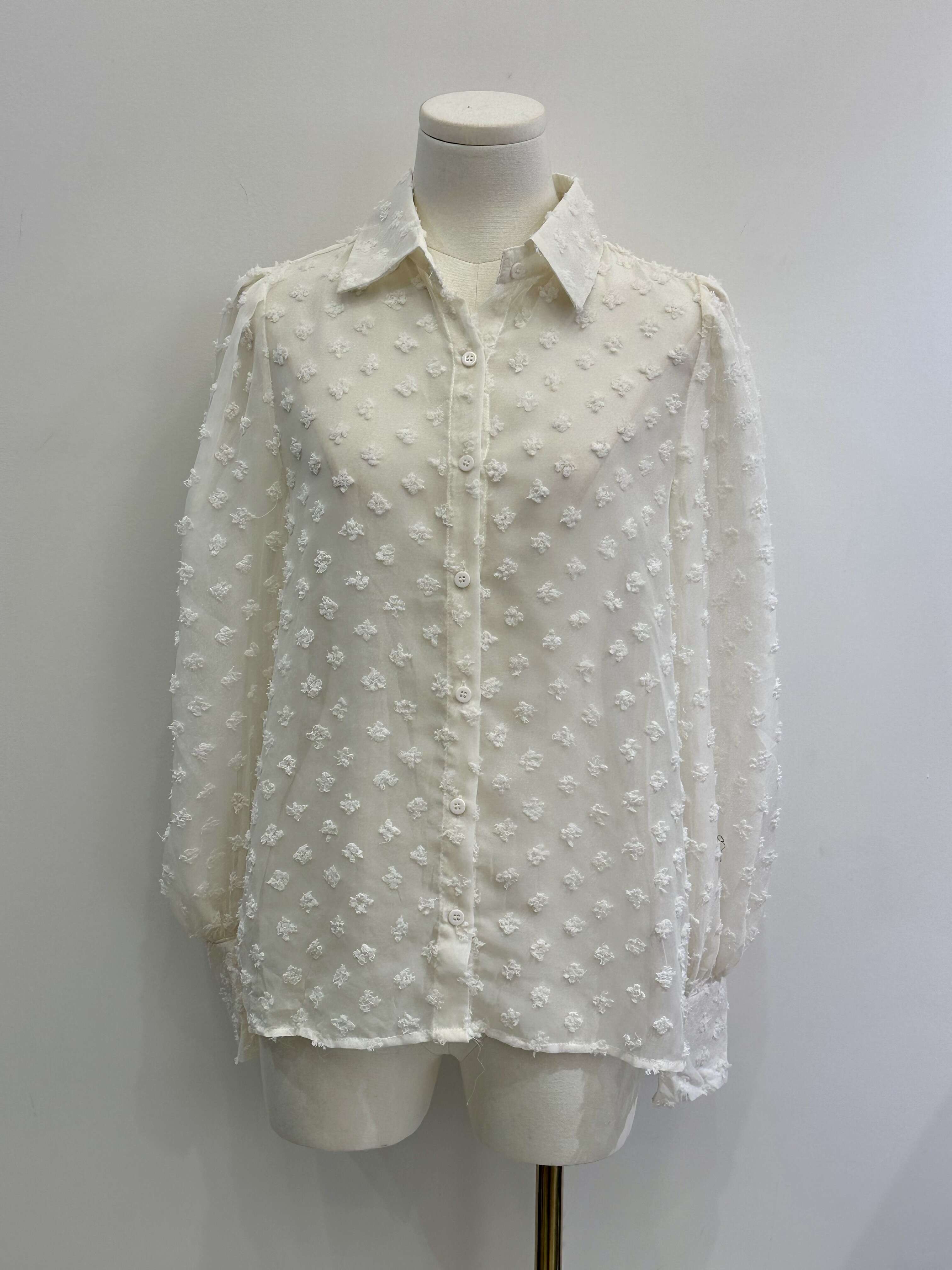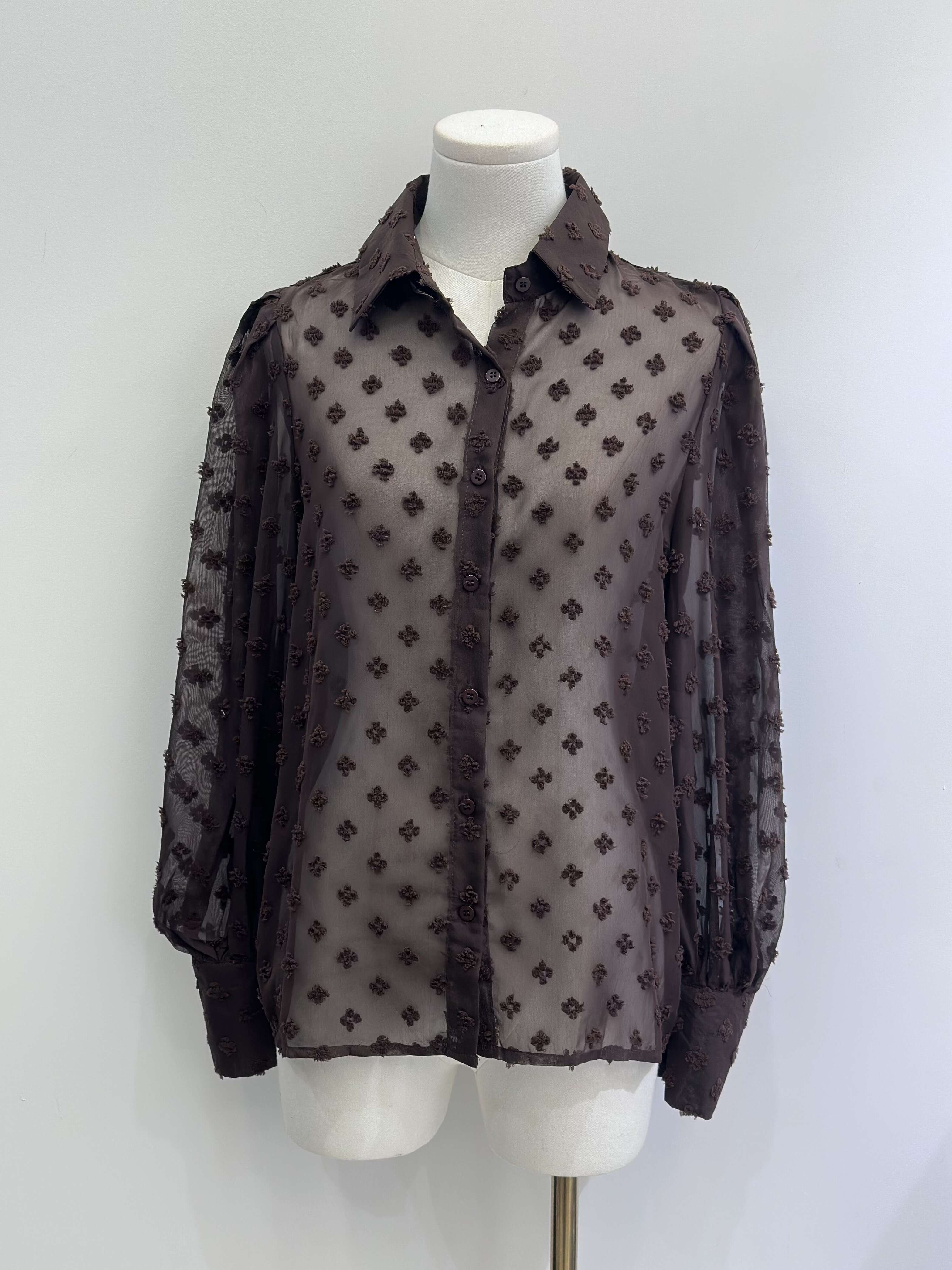 Przewiewna, stylowa koszula z romantycznej siateczki z delikatnym flokiem – kobiecy fason, wygoda i modny look.