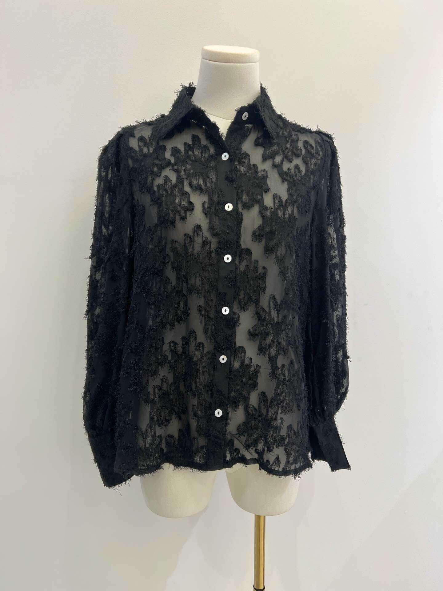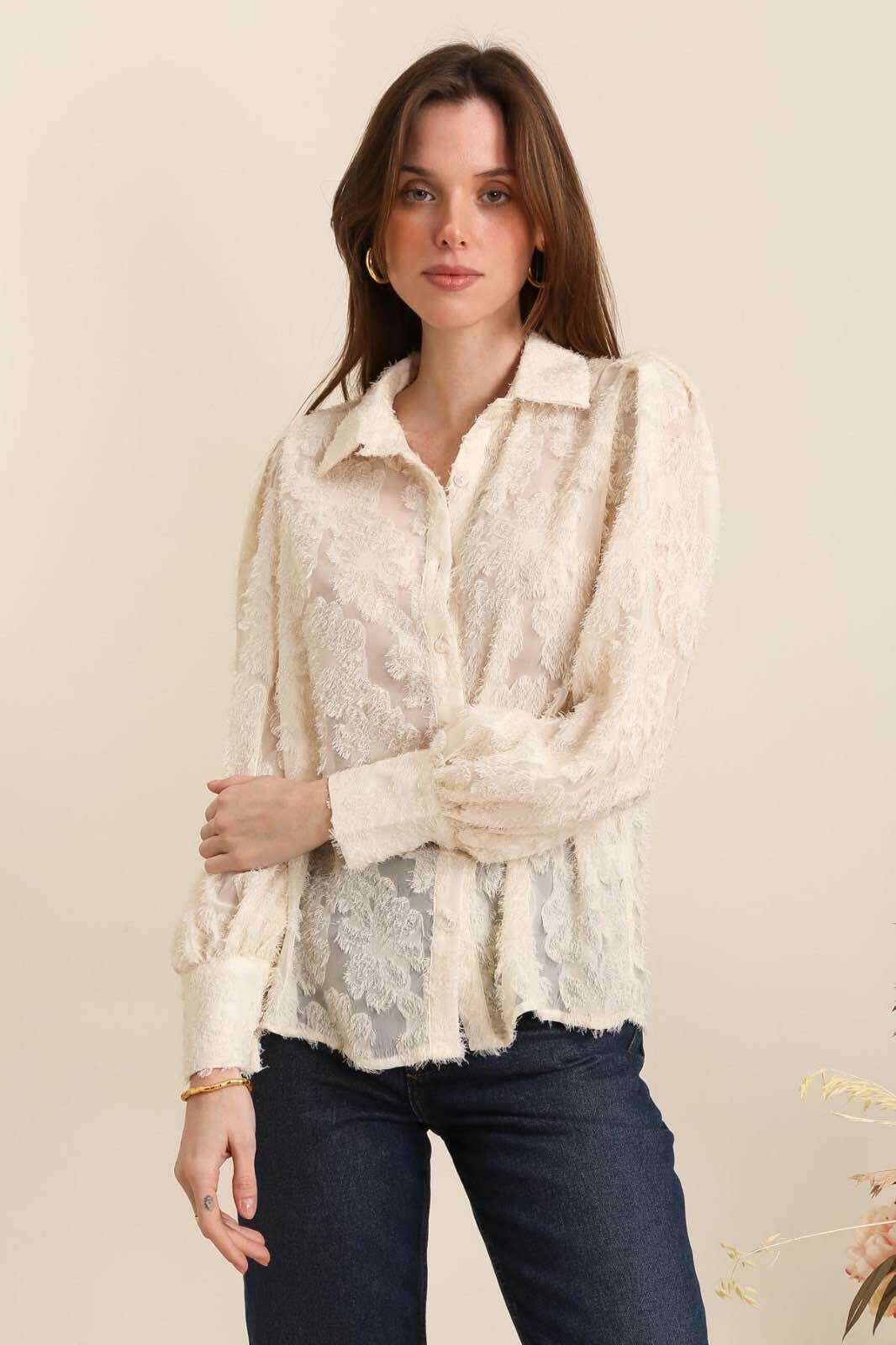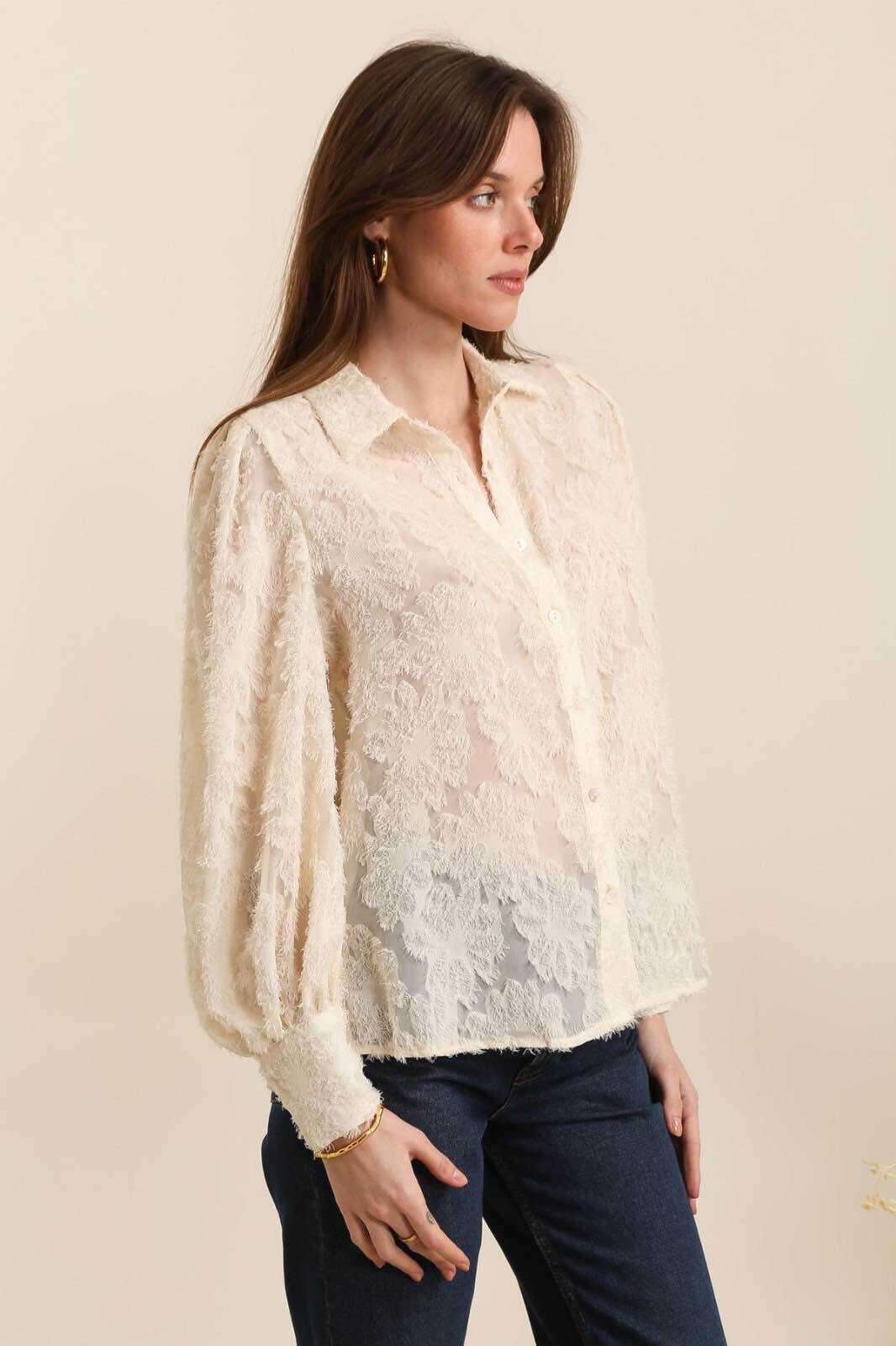 Modna koszula z efektowną fakturą, lekko transparentna, w uniwersalnym kroju – idealna na eleganckie stylizacje i wyjątkowe okazje.