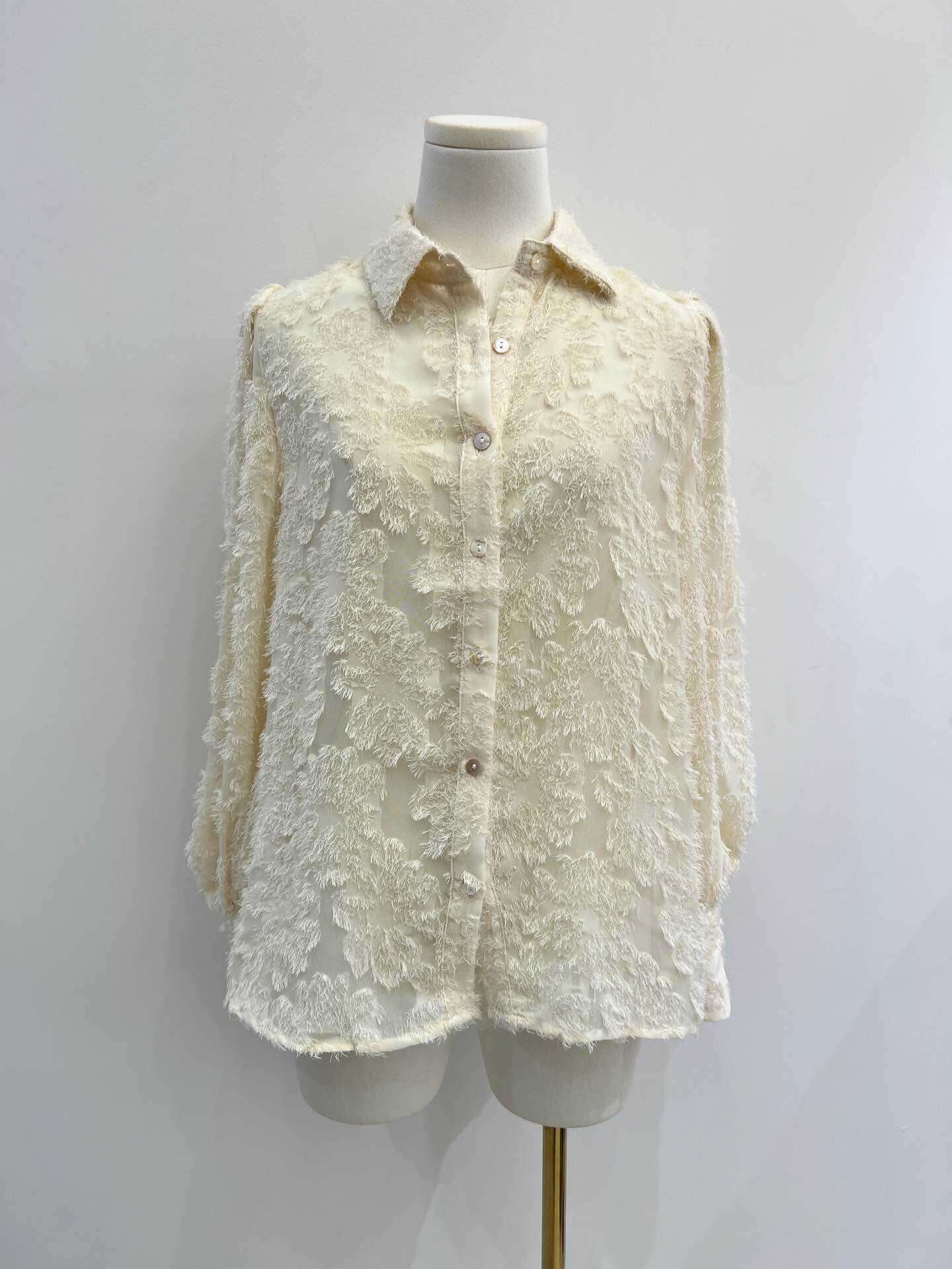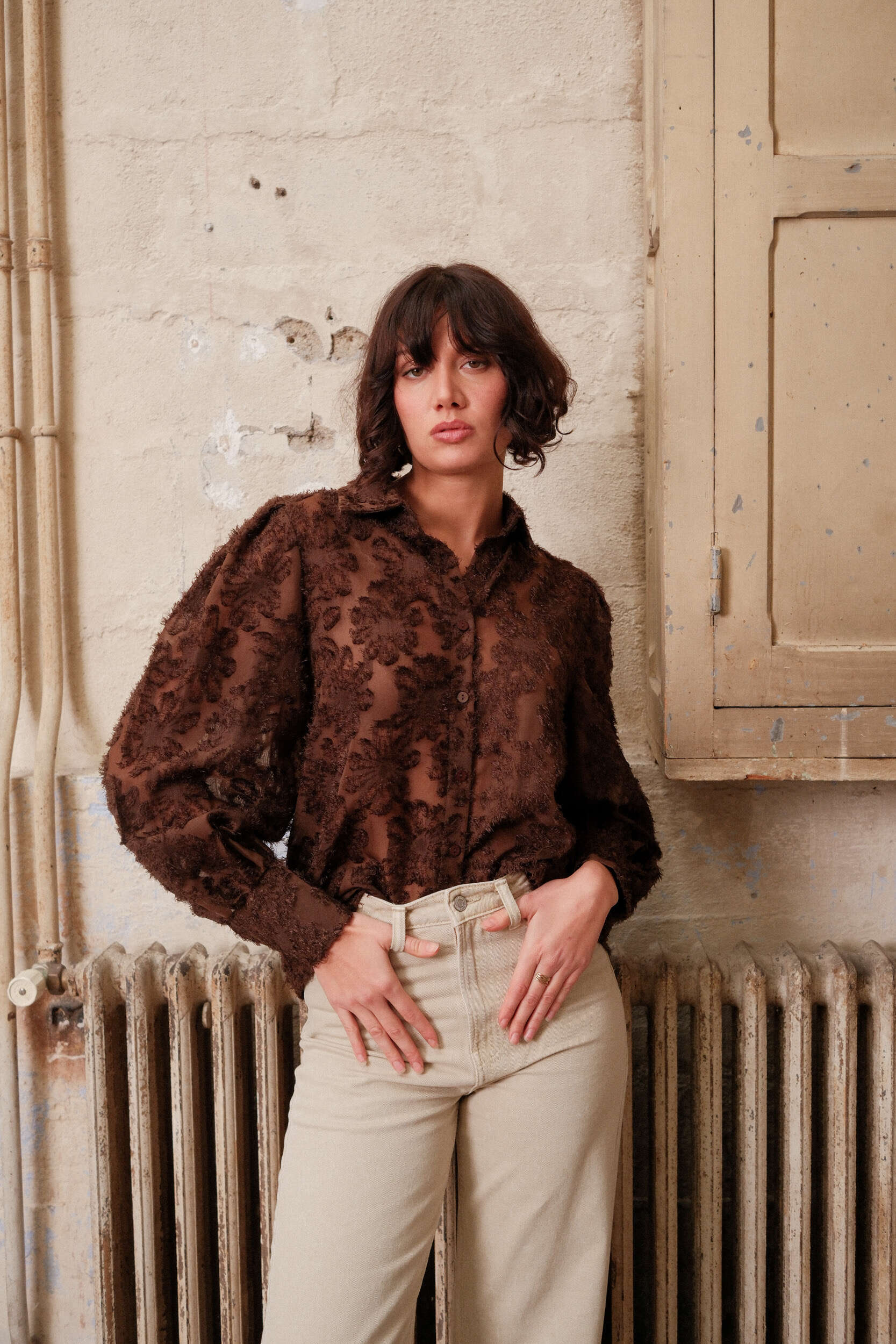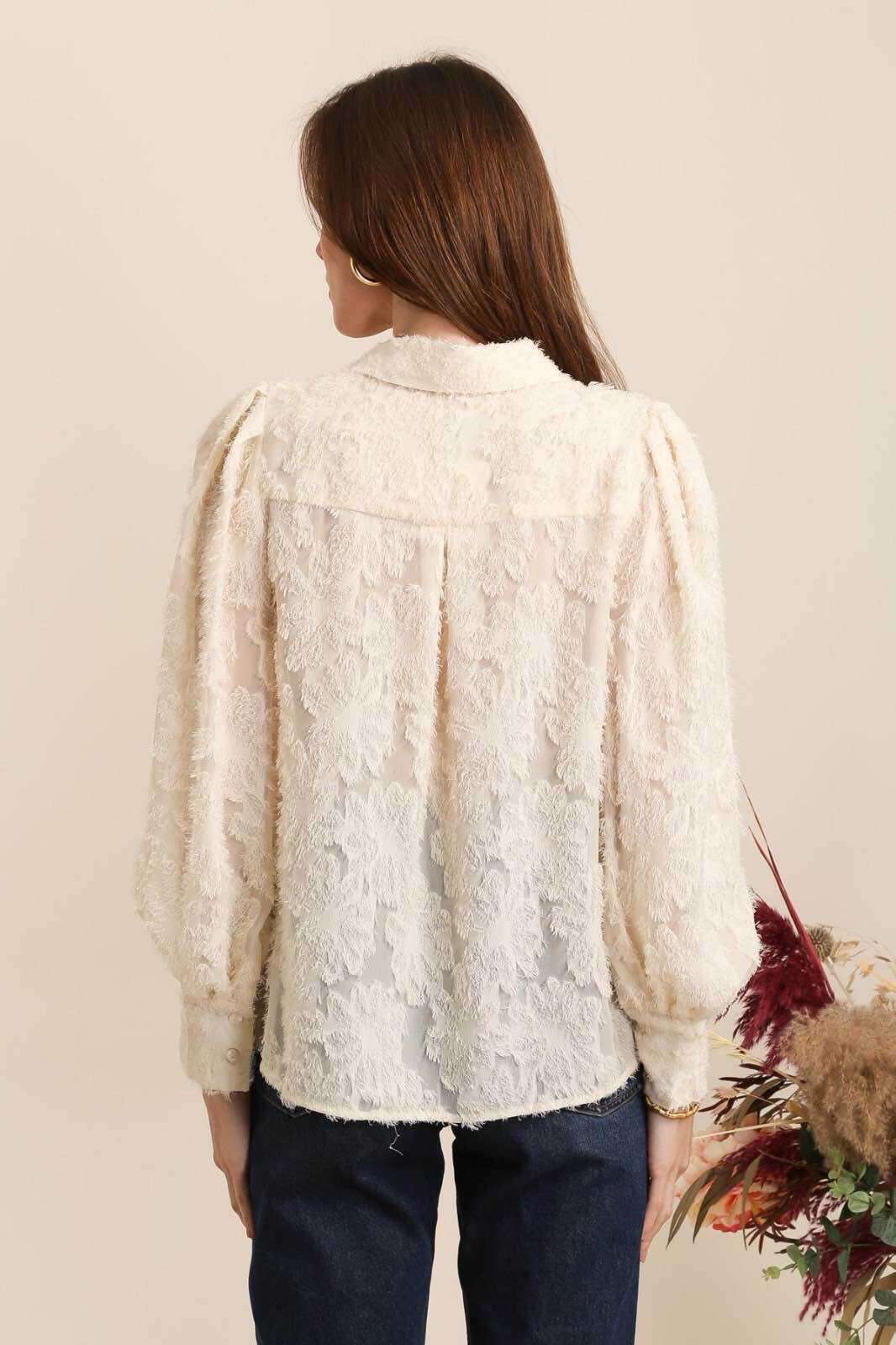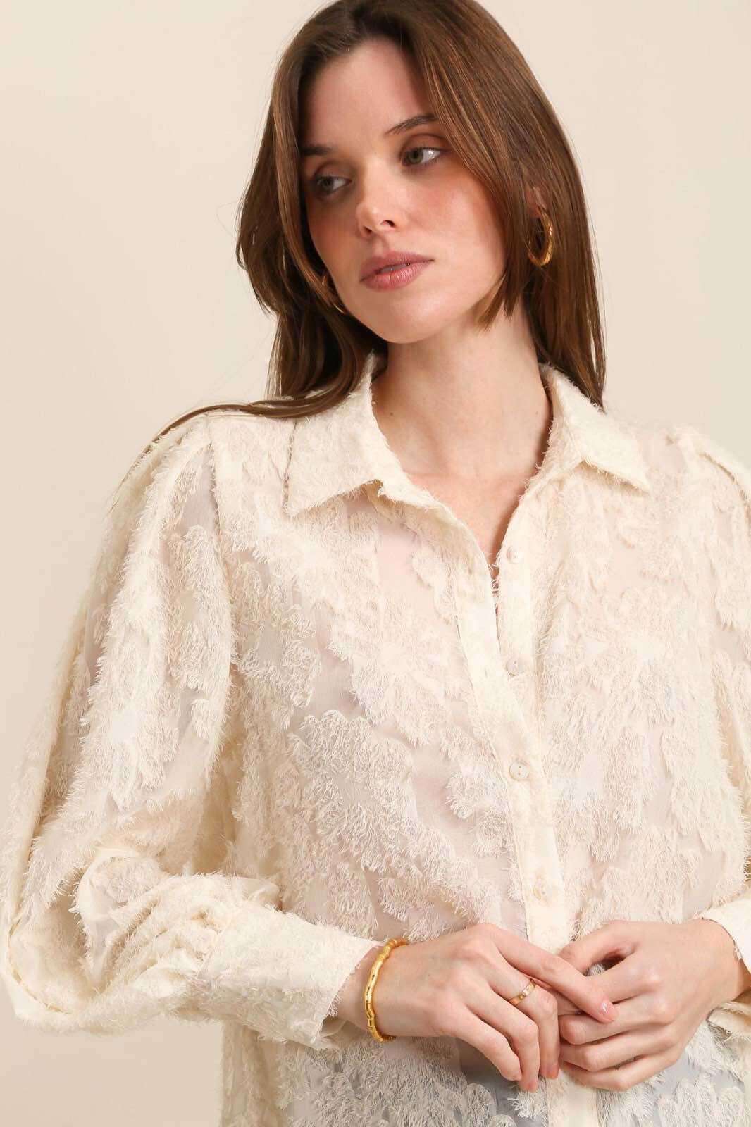 Modna koszula z efektowną fakturą, lekko transparentna, w uniwersalnym kroju – idealna na eleganckie stylizacje i wyjątkowe okazje.