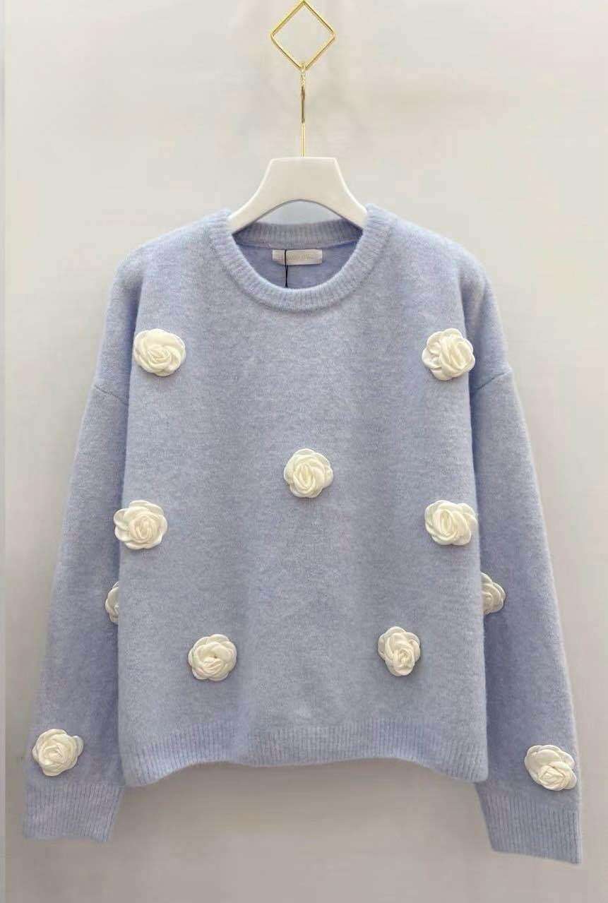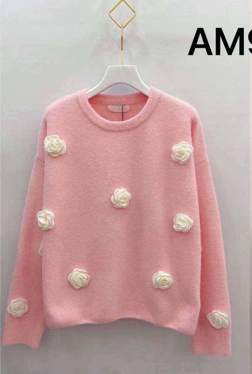 Sweter o luźnym kroju z dekoracyjnymi aplikacjami róż, wykonany z miękkiego materiału w modnym beżowym kolorze. Doskonały komfort i oryginalny styl na co dzień.