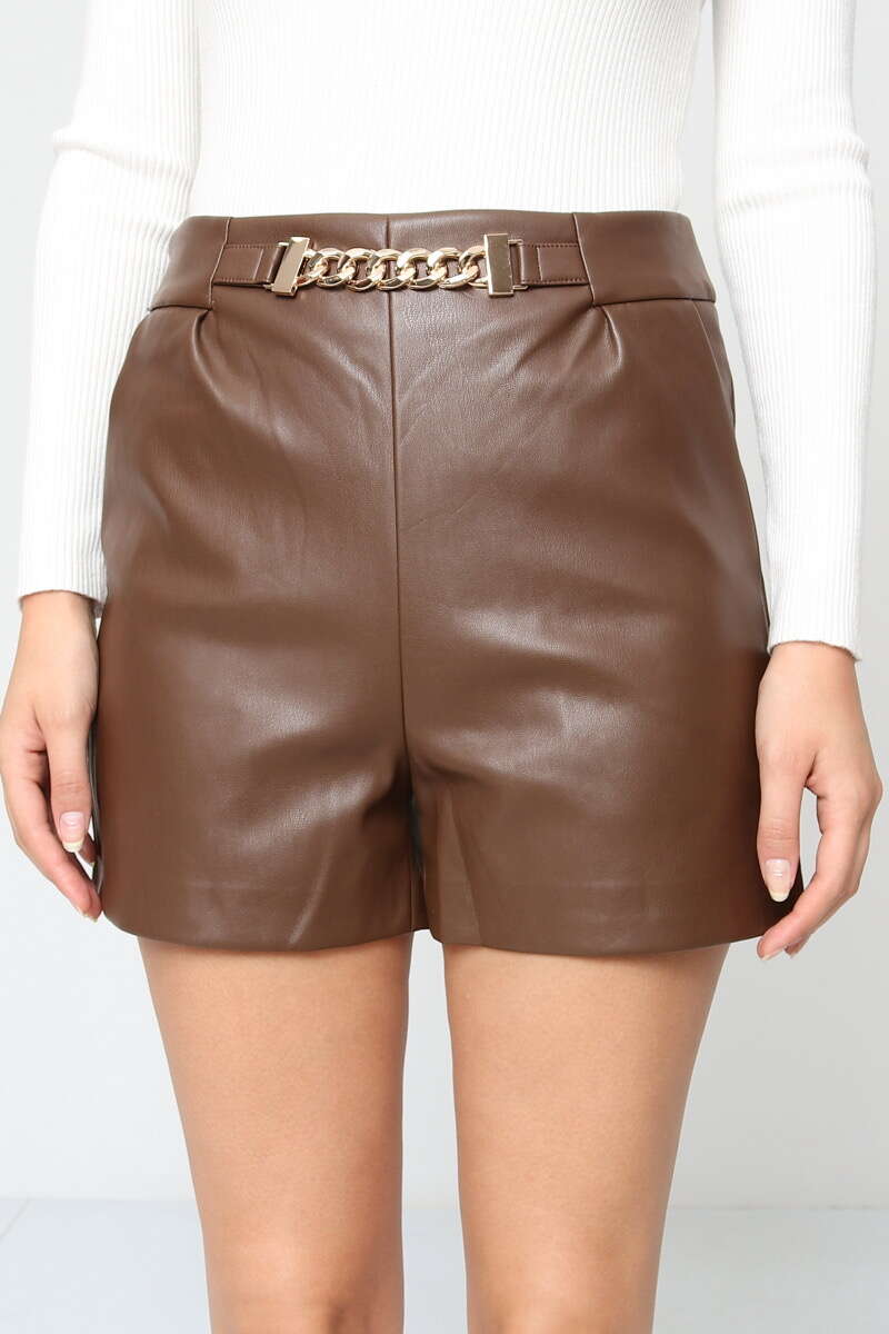 Modne, skórzane szorty z eleganckim paskiem na łańcuszku. Doskonały krój podkreślający sylwetkę i zapewniający wygodę przez cały dzień.