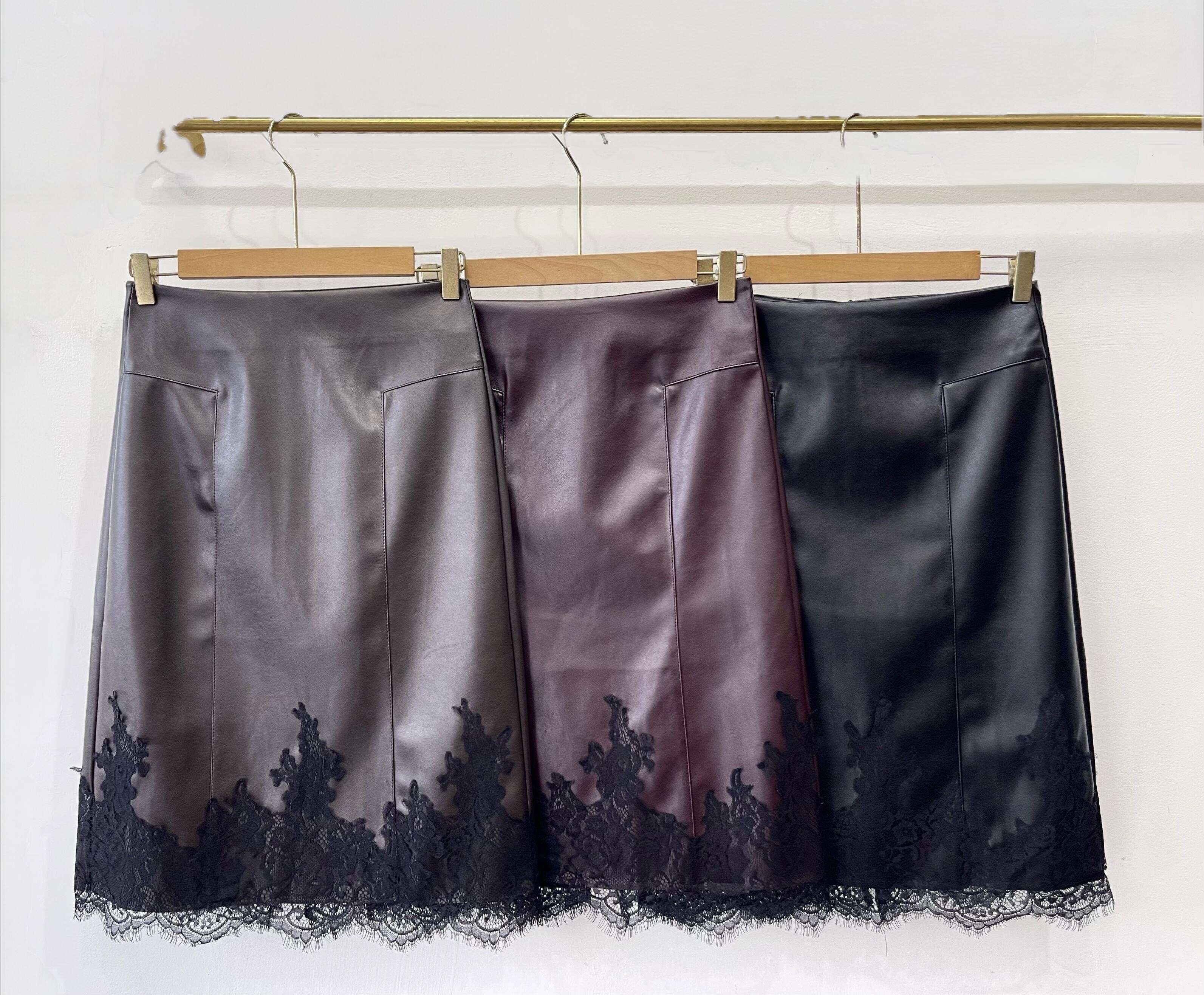 Spódnica o klasycznym kroju, wykonana z ekologicznej skóry z efektowną koronką na dole. Wyjątkowy styl, komfort noszenia i modne kolory: czekoladowy, czarny, bordo.