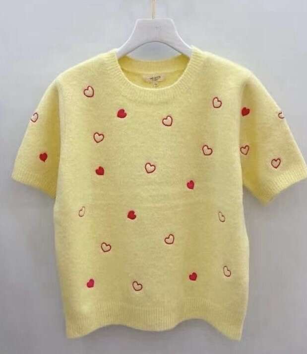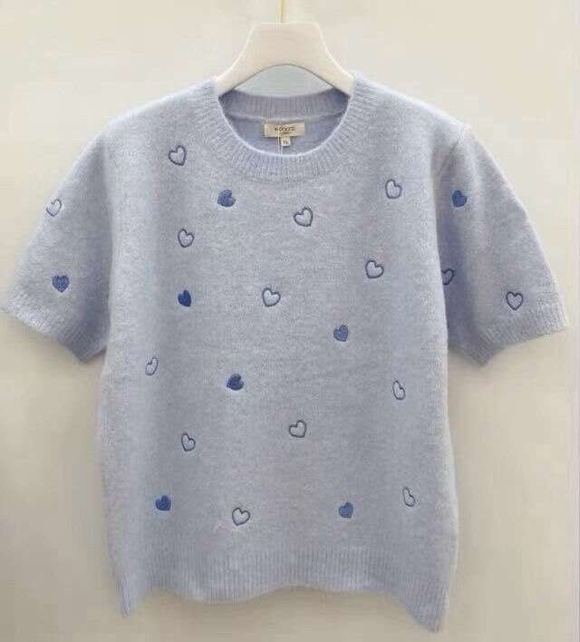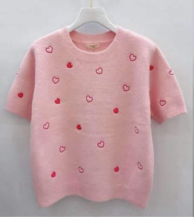 Sweter z krótkim rękawem, luźny krój, delikatna dzianina z uroczym motywem serduszek.