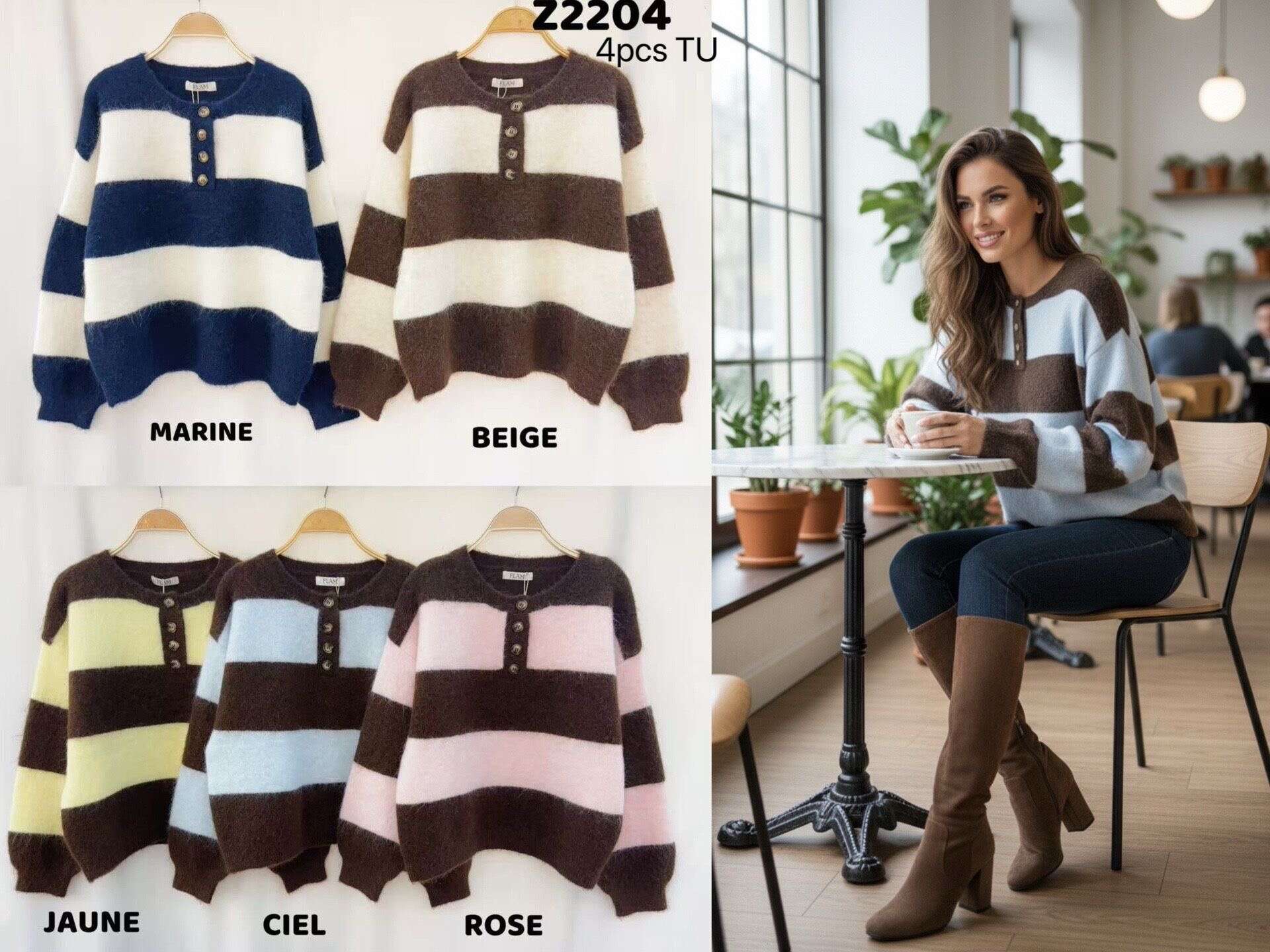 Odkryj swetry oversize z modnym wzorem w szerokie pasy, które uwielbiają kobiety! Dostępne w pięciu stylowych kolorach: żółtym, różowym, granatowym, błękitnym oraz czekoladowo-beżowym – z łatwością dobierzesz wariant do aktualnych trendów. Sweter wykonany jest z miękkiej, przyjemnej w dotyku dzianiny zapewniającej komfort przez cały dzień. Krój oversize i stylowe guziki przy dekolcie sprawdzą się zarówno w stylizacjach casualowych, jak i na spotkania z przyjaciółmi czy na co dzień do pracy. W sprzedaży hurtowej, w rozmiarze uniwersalnym – idealne rozwiązanie dla butików i sklepów, które cenią jakość i różnorodność asortymentu.