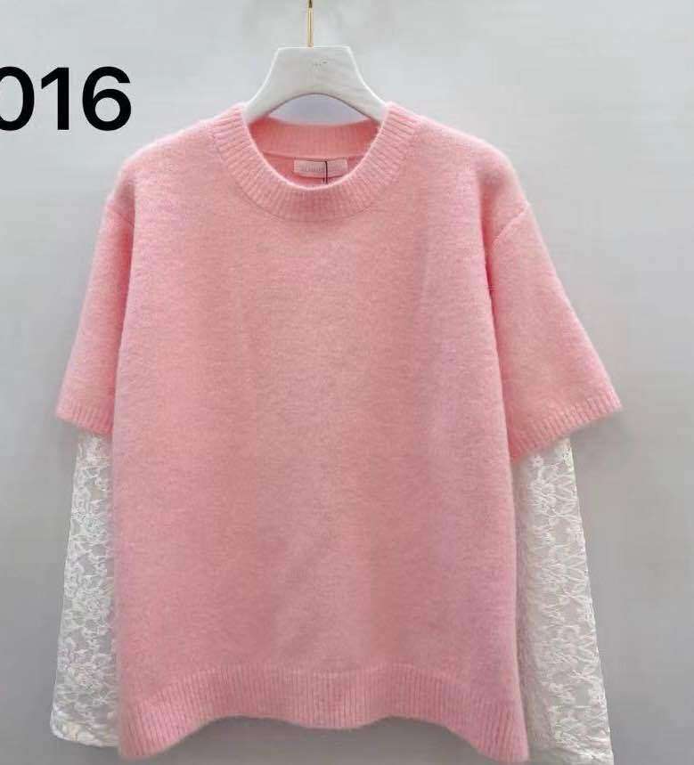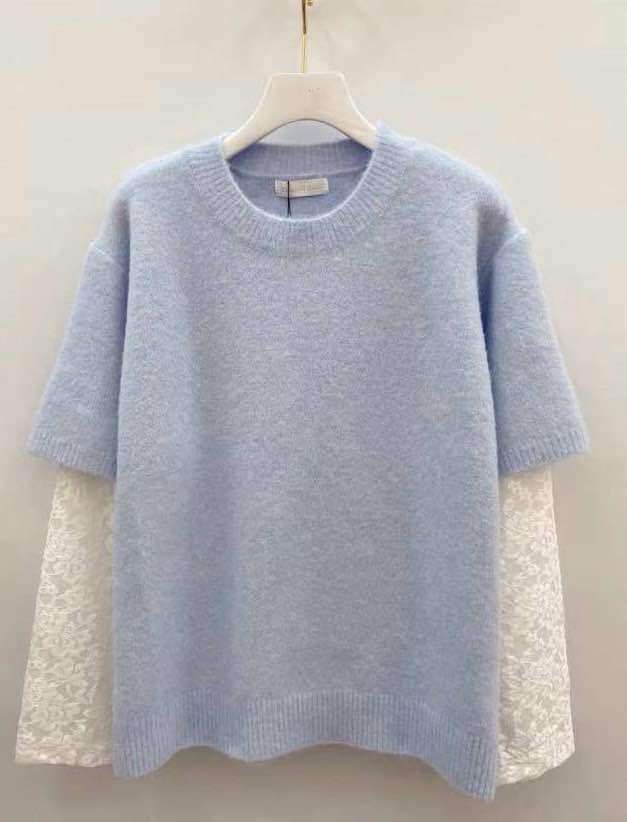 Nowoczesny sweter z krótkim rękawem, wykończony efektowną, koronkową aplikacją – doskonałe połączenie wygody i subtelnej elegancji.