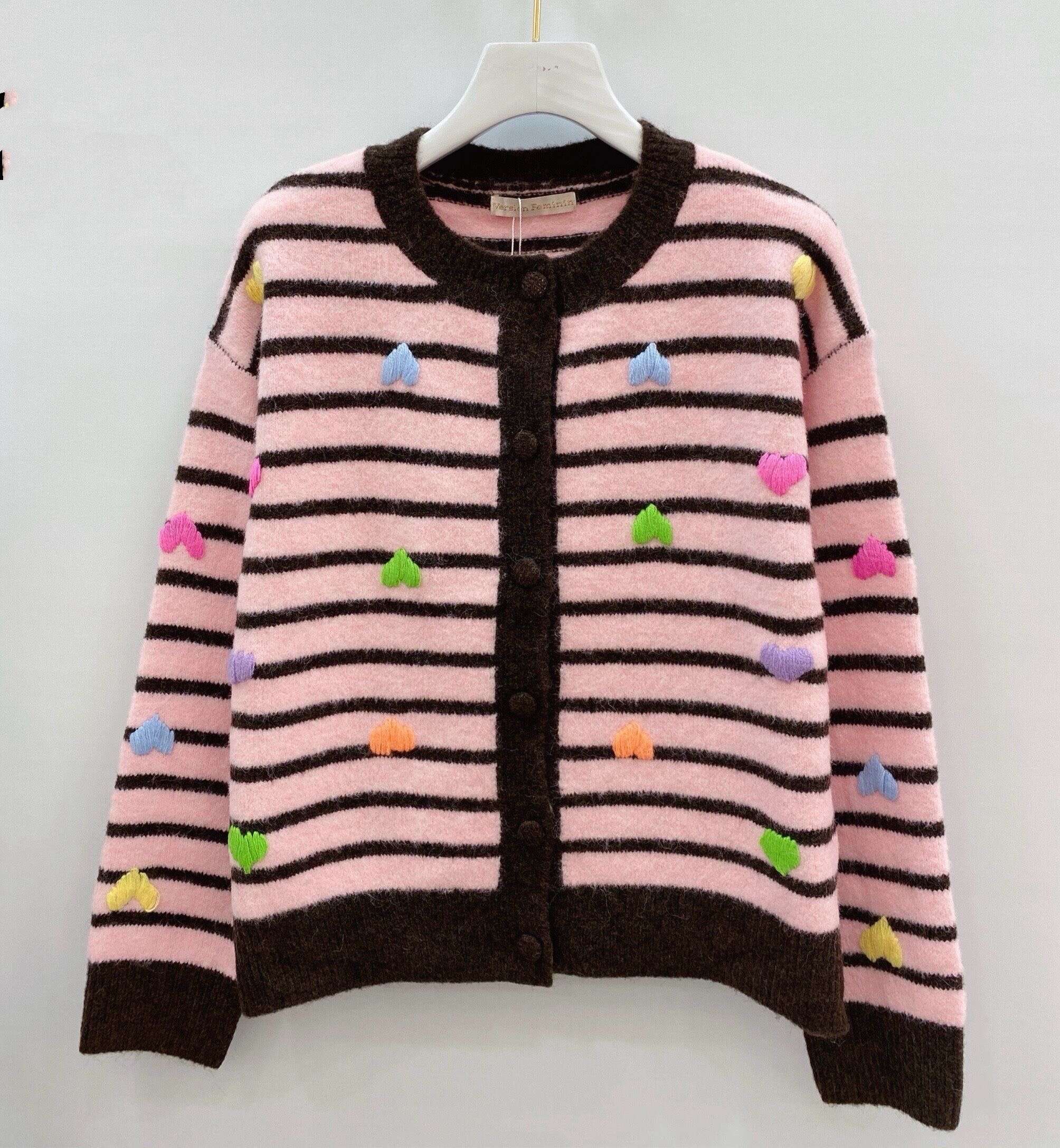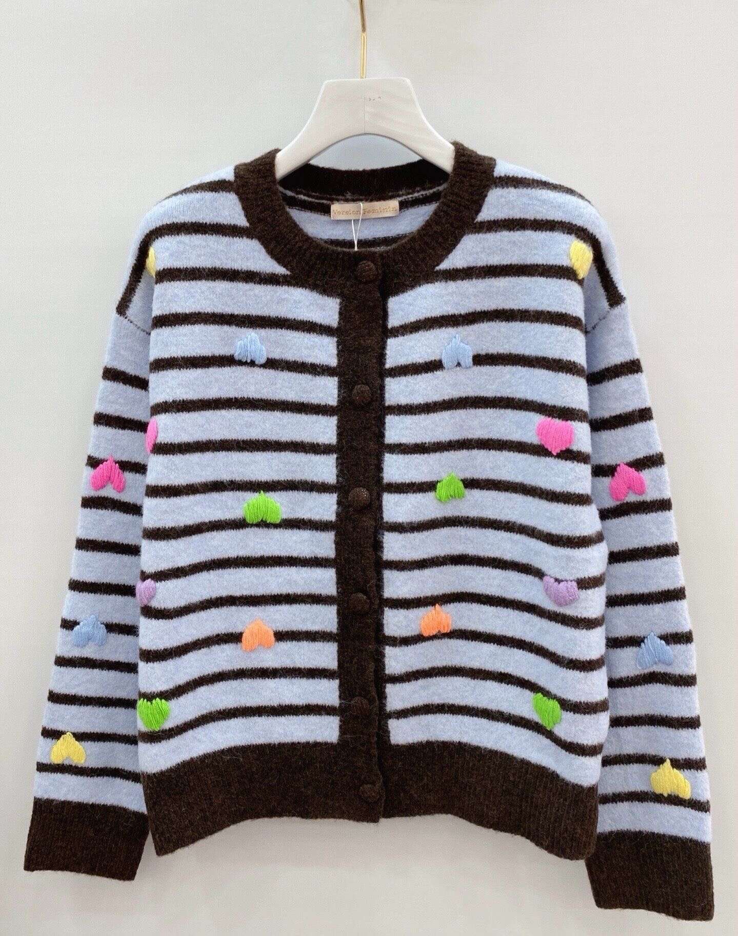 Klasyczny kardigan w paski z kolorowymi aplikacjami, wygodny fason i miękki materiał idealny na każdą okazję.
